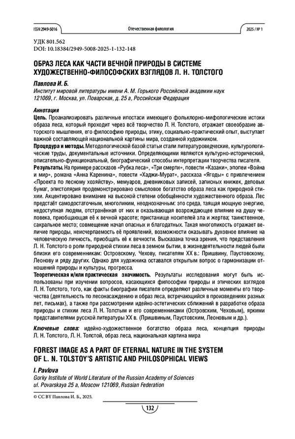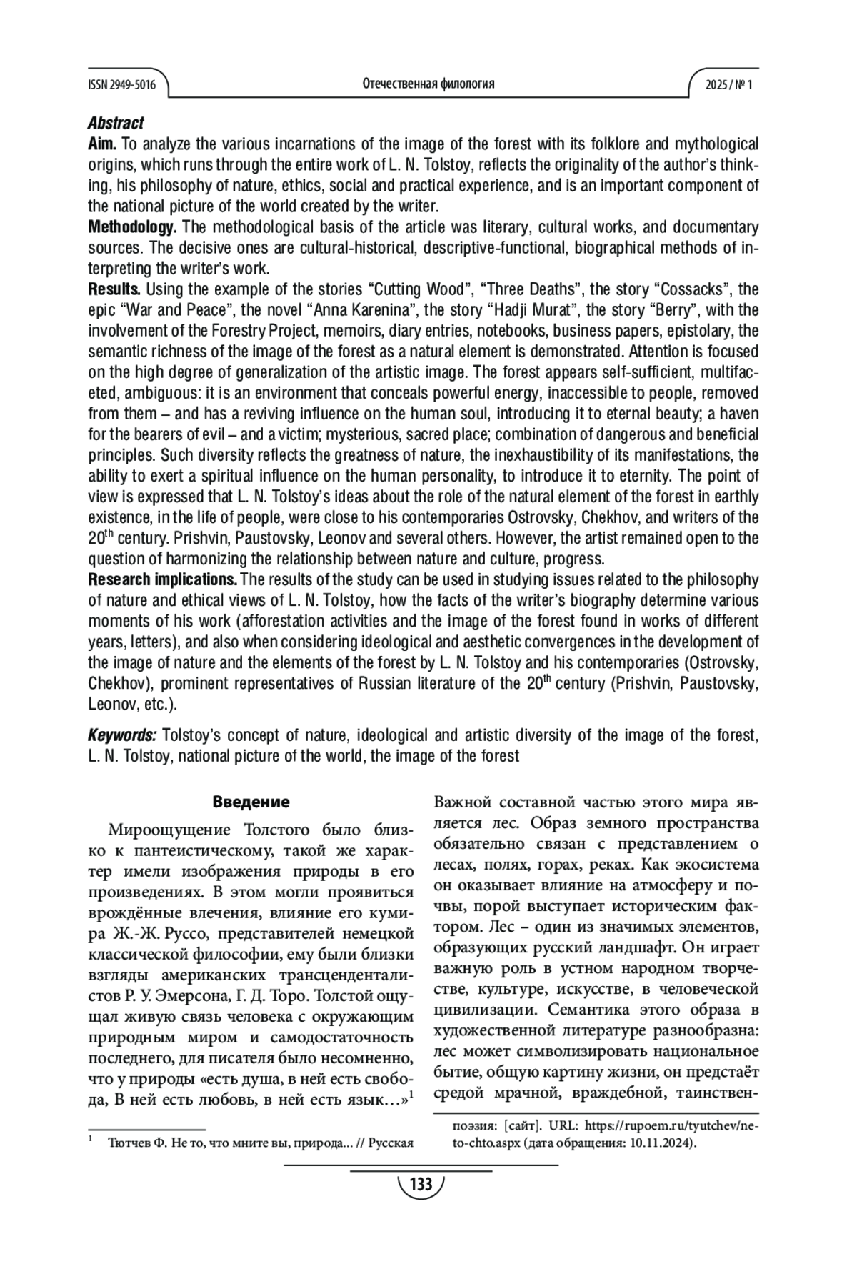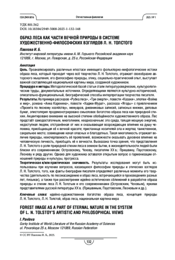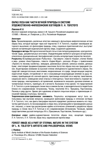 Цель. Проанализировать различные ипостаси имеющего фольклорно-мифологические истоки образа леса, который проходит через всё творчество Л. Н. Толстого, отражает своеобразие авторского мышления, его философию природы, этику, социально-практический опыт, выступает важной составляющей национальной картины мира, созданной художником.