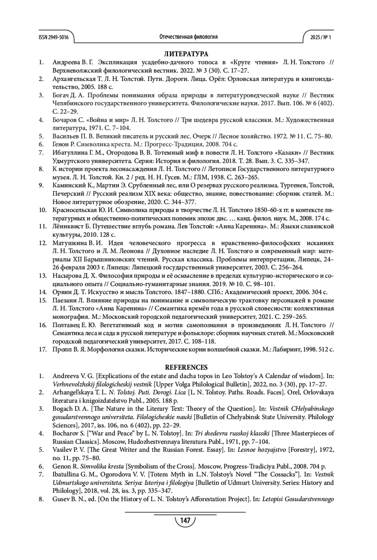 7. Ибатуллина Г. М., Огородова В. В. Тотемный миф в повести Л. Н. Толстого «Казаки» // Вестник Удмуртского университета. Серия: История и филология. 2018. Т. 28. Вып. 3. С. 335-347.