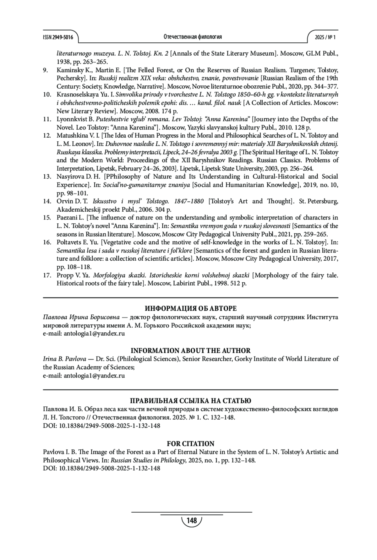 15. Паезани Л. Влияние природы на понимание и символическую трактовку персонажей в романе Л. Н. Толстого «Анна Каренина» // Семантика времён года в русской словесности: коллективная монография. М.: Московский городской педагогический университет, 2021. С. 259-265.