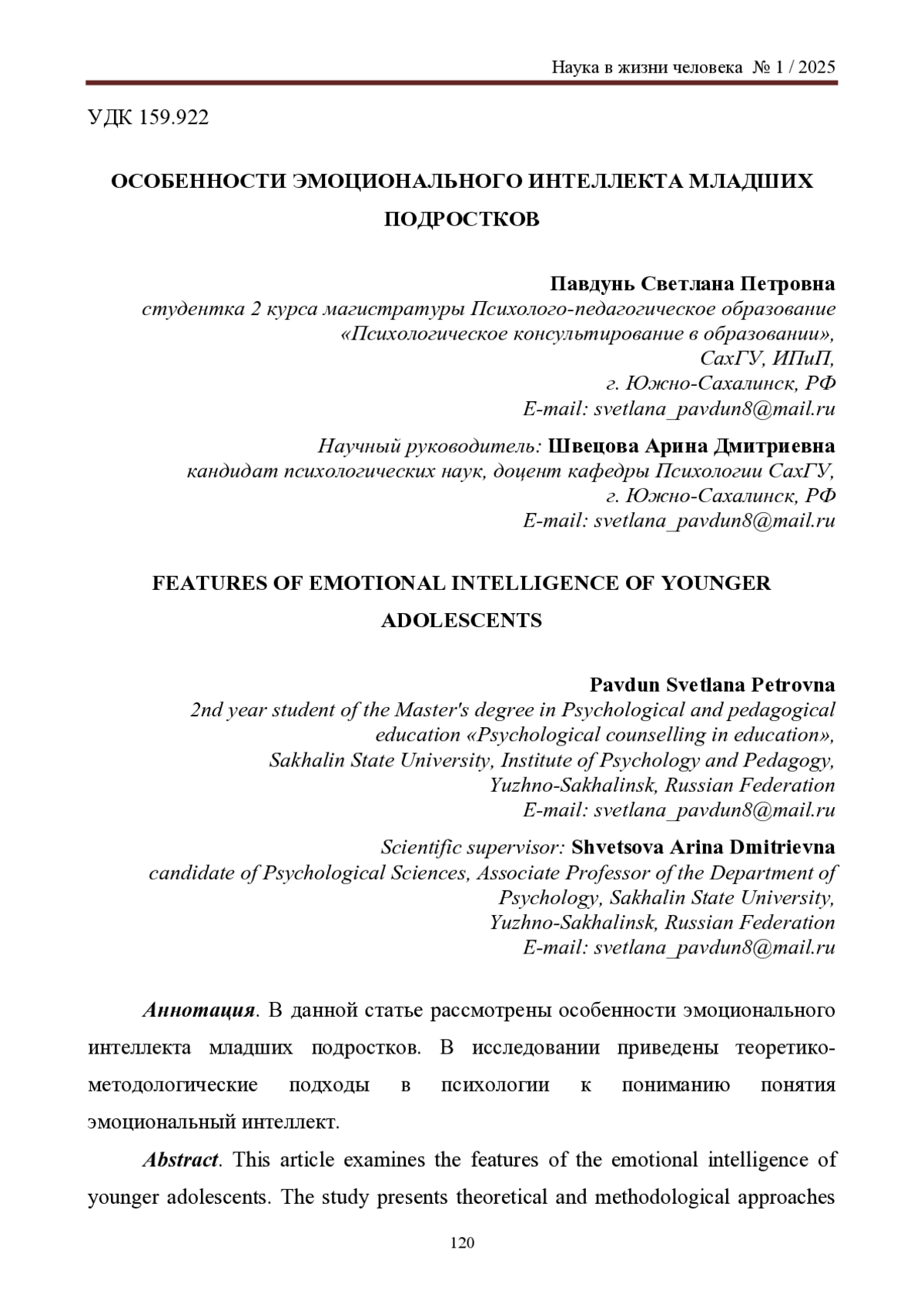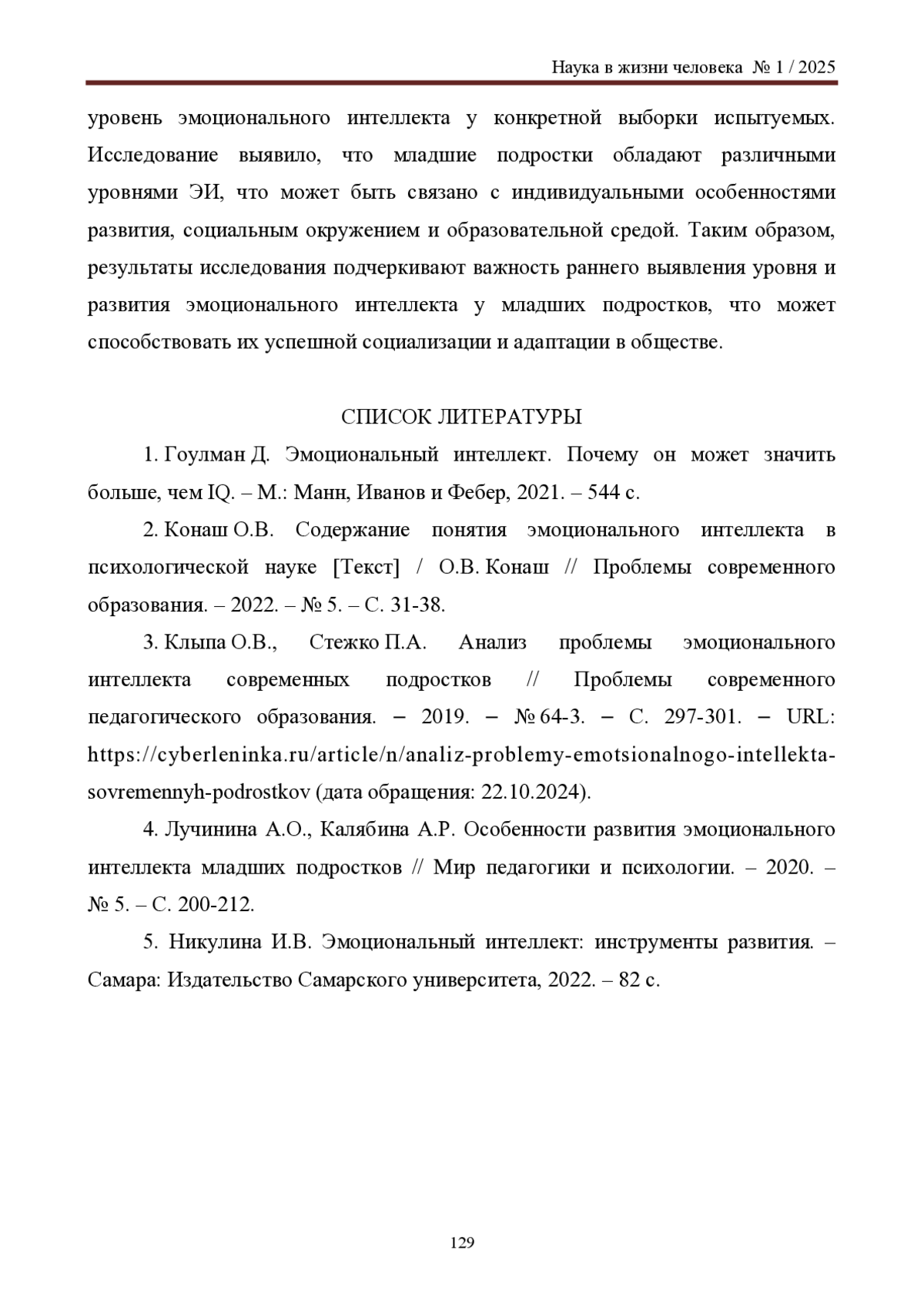 3. Клыпа О.В., Стежко П.А. Анализ проблемы эмоционального интеллекта современных подростков // Проблемы современногопедагогического образования. ‒ 2019. ‒ № 64-3. ‒ С. 297-301. ‒ U