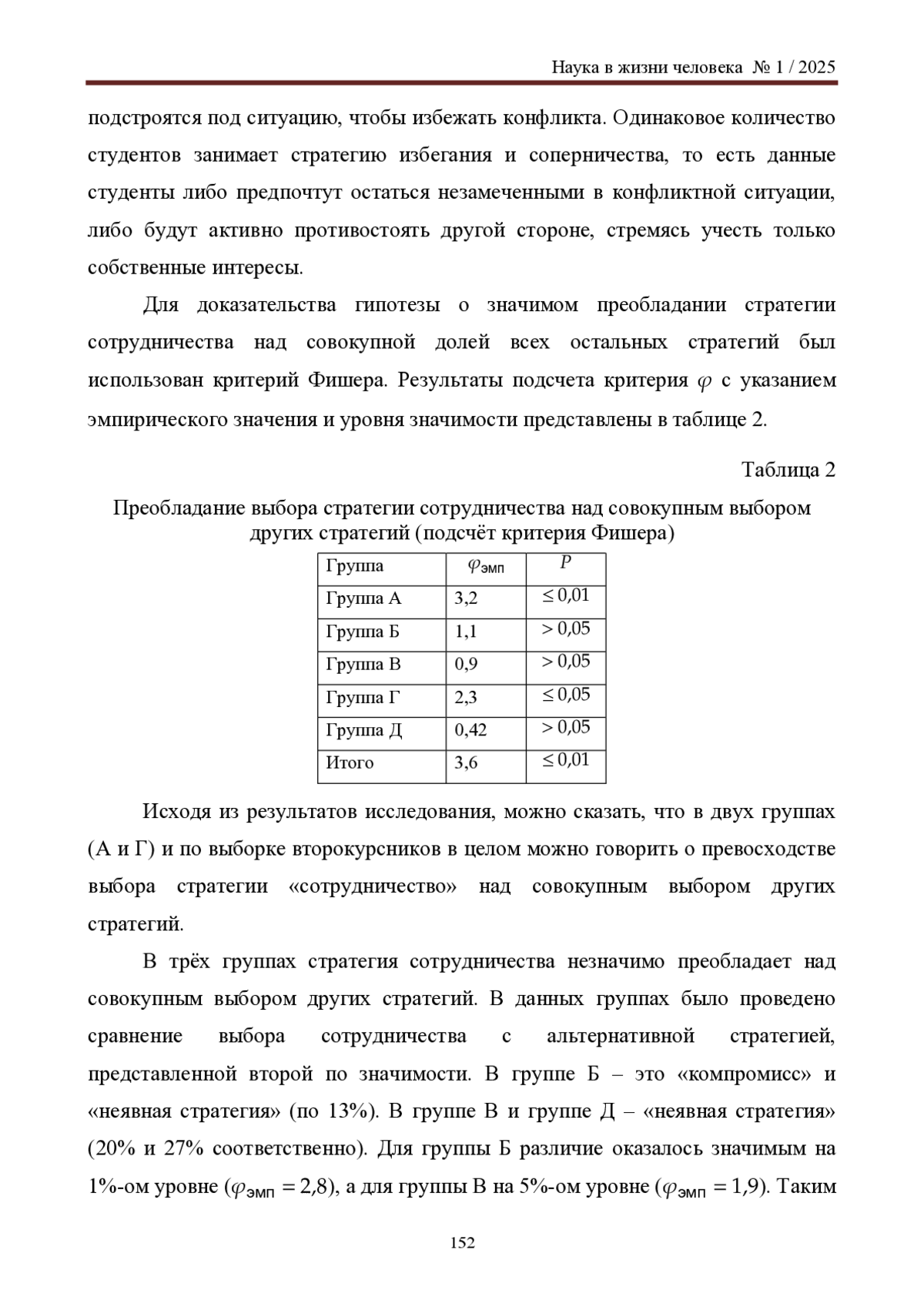 Статья посвящена актуальной теме – правильному выбору стратегии поведения в конфликтной ситуации. В данной работе раскрывается сущность пяти стратегий и целесообразность их использования в зависимости от характера протекания конфликта и его особенностей. Особое внимание уделено вопросу предпочитаемого стиля поведения у студентов ‒ будущих преподавателей в конфликтных ситуациях. Дано описание эмпирического исследования и представлены его результаты, посредством анализа которых с помощью математической обработки информации (использованием критерия Фишера) была выявлена преобладающая среди студентов стратегия поведения в конфликте. Полученные результаты исследования были проинтерпретированы. В заключении статьи приводятся рекомендации для педагогов по предотвращению и профилактике конфликтных ситуаций в образовательном процессе.