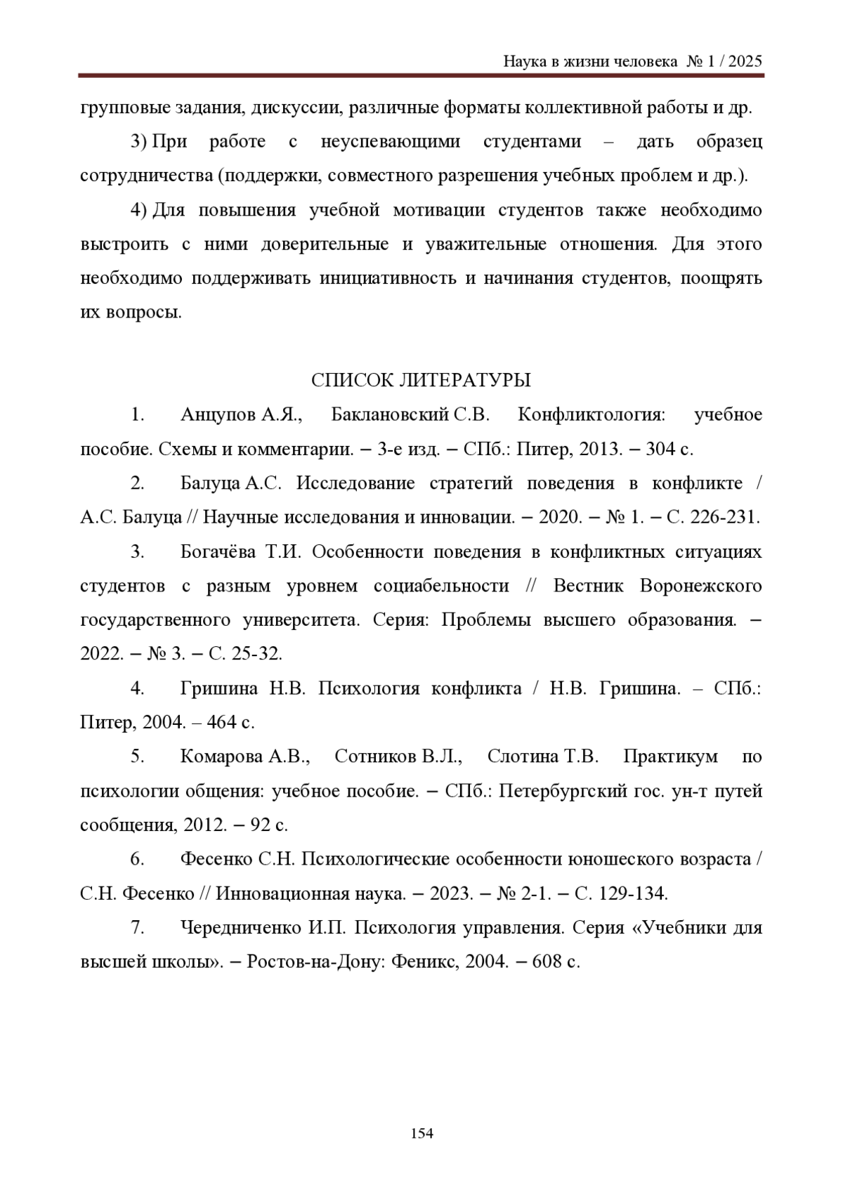 3. Богачёва Т.И. Особенности поведения в конфликтных ситуациях студентов с разным уровнем социабельности // Вестник Воронежского государственного университета. Серия: Проблемы высшего образования. ‒ 2022. ‒ № 3. ‒ С. 25-32.