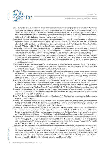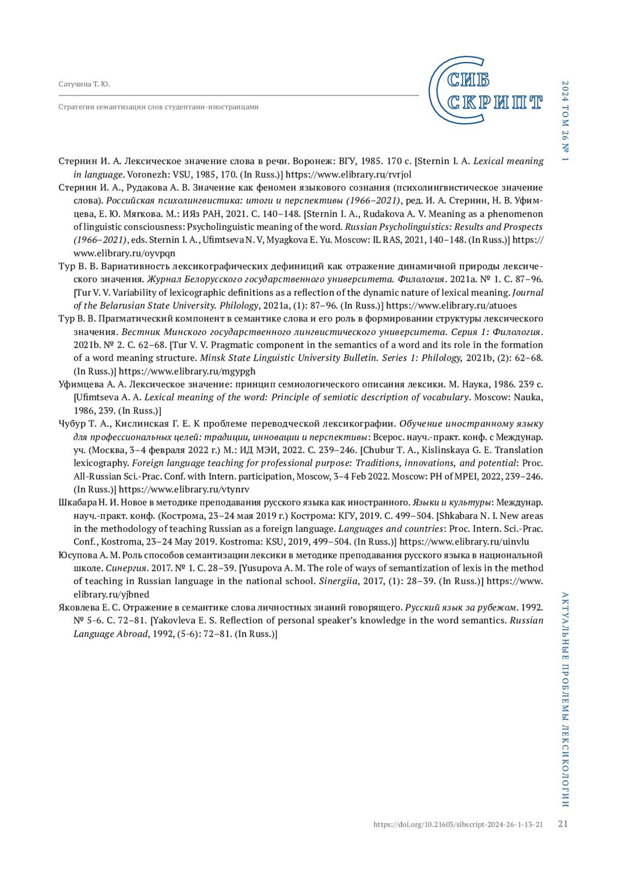 15. Левенталь И. В. Семантизация лексических единиц в учебных словарях для иностранцев: поиск нового подхода. Филологические науки. Вопросы теории и практики. 2014a. № 6-2. С. 120-125. EDN: SCZVFX