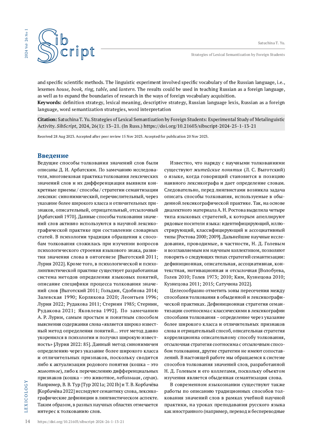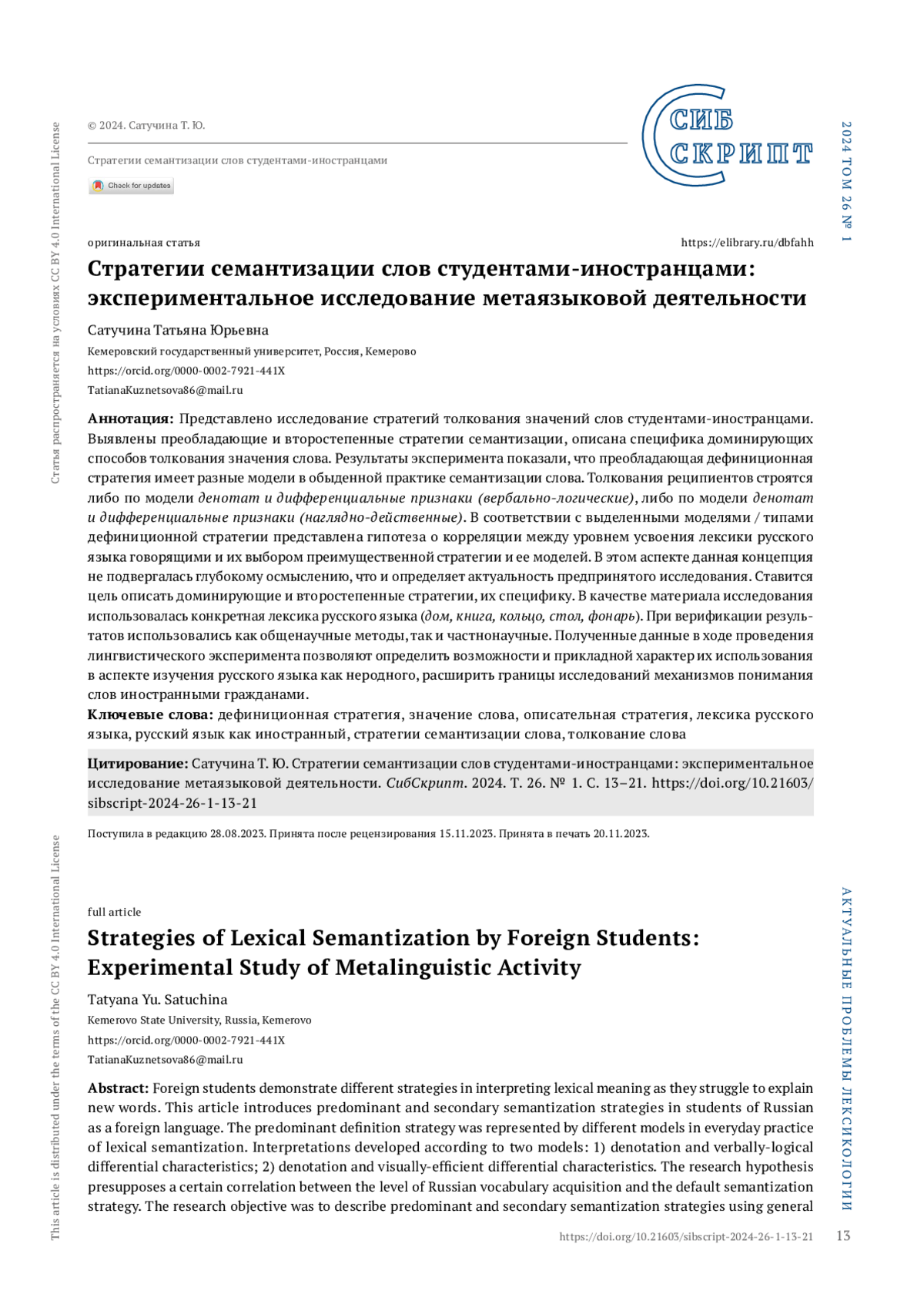 22. Сатучина Т. Ю. Описывающая и отождествляющая стратегии семантизации слов (экспериментальное исследование метаязыковой деятельности говорящих). Актуальные вопросы лингвистики и литературоведения: Междунар. науч. конф. (Кемерово, 3-5 февраля 2022 г.) Кемерово: КемГУ, 2022. С. 187-190. EDN: TUFDZE