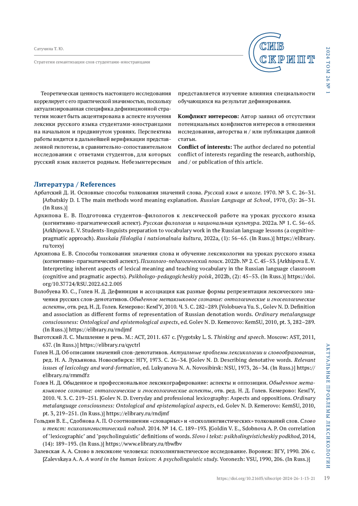 3. Архипова Е. В. Способы толкования значения слова и обучение лексикологии на уроках русского языка (когнитивно-прагматический аспект). Психолого-педагогический поиск. 2022b. № 2. С. 45-53. DOI: 10.37724/RSU.2022.62.2.005 EDN: CHMFHF