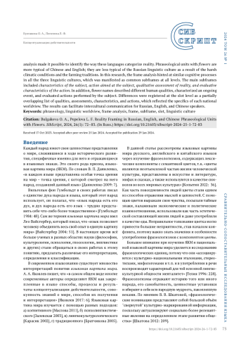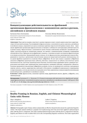 Язык цветов издавна существует у разных народов и может служить ярким средством характеристики той или иной культуры. Рассматриваются фразеологизмы с компонентом цветы в русском, английском и китайском языках, определяется их роль в языковых картинах мира носителей данных языков. Цель - через анализ фреймовой организации фразеологизмов установить особенности категоризации действительности в разных языках. Фразеологизмы с компонентом цветы больше свойственны китайской и английской культурам, в русской культуре их значительно меньше, что связано с климатическими условиями и традициями земледелия на Руси. Применен метод фреймового анализа, с помощью которого исследуются фразеологизмы в последние десятилетия. Проведенный анализ показал, что во фразеологизмах анализируемых языков обнаруживаются сходства в организации мыслительных процессов представителей разных лингвокультур, что на уровне фреймов проявляется в наличии общих субфреймов. Во всех трех языках к ядерным субфреймам относятся субфреймы характеристика субъекта, действие, направленное на субъект, качественная оценка действительности, оценочная характеристика действия, носители языка сравнивают цветы с разными человеческими качествами, дают характеристику происходящему, оценивают действия, совершаемые субъектом. Различия проявляются в реализации субфреймов на уровне слотов, что проявляется в частично совпадающем перечне качеств, оценок, характеристик, действий и обусловлено спецификой национального мировидения и миропонимания, поэтому результаты исследования могут быть применены в межкультурной коммуникации носителей русского, английского и китайского языков.