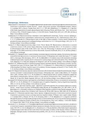 1. Абдуллаева Ф. Э., Булгакова О. А. Специфика фреймовой организации соматических фразеологизмов русского, телеутского и китайского языков. Восток - Запад: пересечение культур: II Всемирный конгресс. (Киото, 2-6 октября 2019 г.) Киото: Tanaka Print, 2019. Т. I. С. 399-406. EDN: IZVIHX