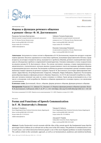Актуальность статьи состоит в обращении к Ф. М. Достоевскому, творчество которого созвучно нашему времени. Писатель задумывался и осмысливал проблемы, волнующие представителей и ХХI века. Среди вопросов, на которые отзывается автор, оказывается и проблема общения, речевого взаимодействия героев, одна из обсуждаемых проблем в современной гуманитаристике. Основное внимание в статье сосредоточено на анализе романа Ф. М. Достоевского «Бесы». На основе системного подхода, а также герменевтического, аналитического, статистического методов анализа художественного текста исследована проблема общения в произведении русского писателя. Рассмотрены особенности речевого вхождения в роман основных героев, выявлены главные приметы их речевого портрета. Герои Ф. М. Достоевского, на которых сфокусировано внимание: Дарья Шатова, Петр Верховенский, Ставрогин, Лебядкин, Марья Лебядкина, Кириллов. Рассмотрены разнообразные формы и функции речевого общения. Выявлено, что Ф. М. Достоевский потребность в общении для человека понимает как одну из самых основных и стойких. Герои автора испытываются им, в том числе в отношении этой потребности. Именно в общении проявляется и позиция героев, и их жизненная состоятельность.