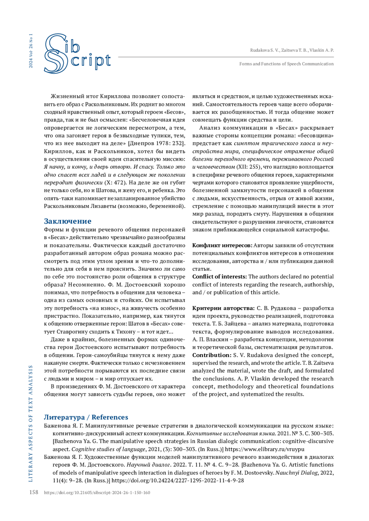 2. Баженова Я. Г. Художественные функции моделей манипулятивного речевого взаимодействия в диалогах героев Ф. М. Достоевского. Научный диалог. 2022. Т. 11. № 4. С. 9-28. DOI: 10.24224/2227-1295-2022-11-4-9-28 EDN: UZJQOQ