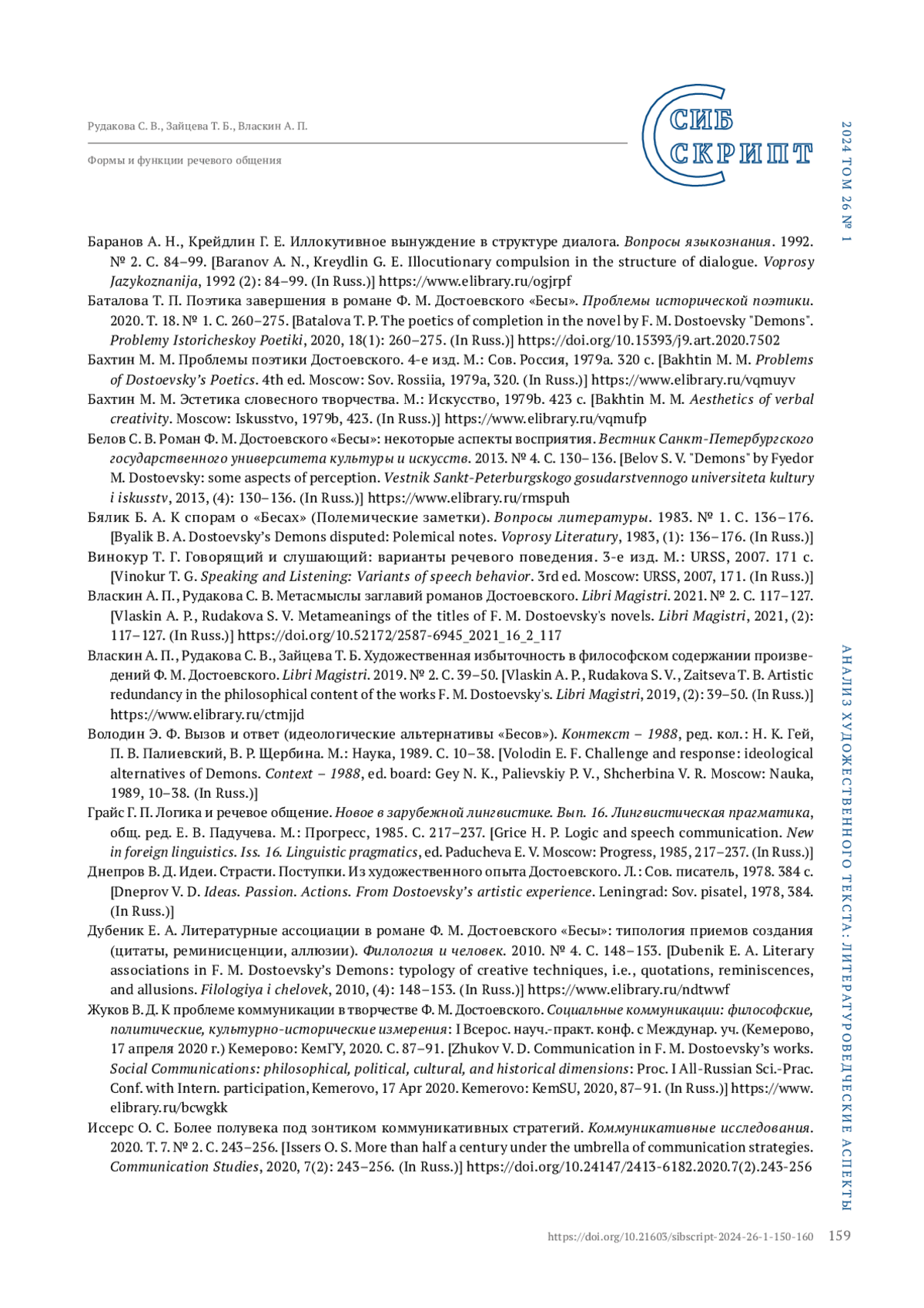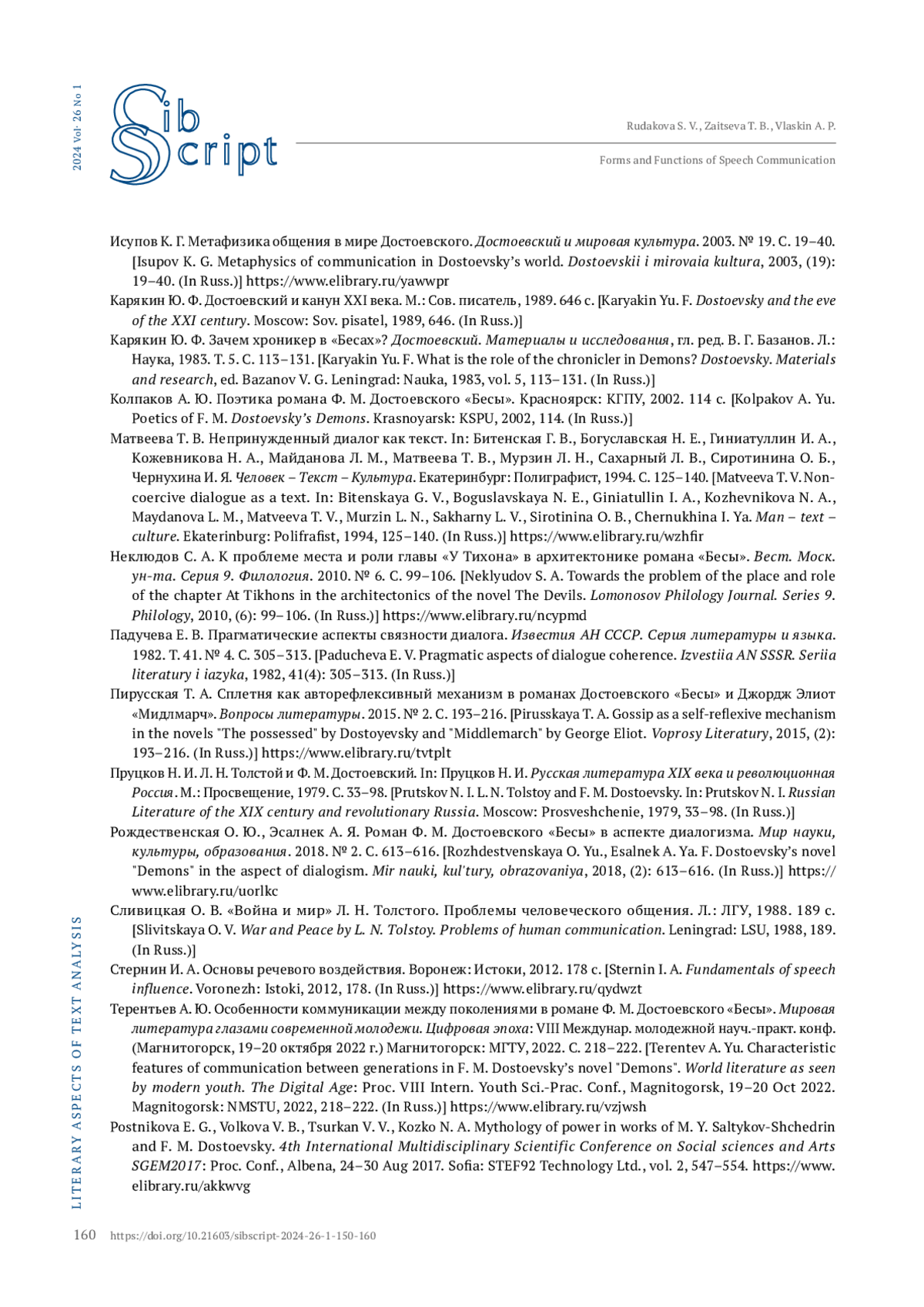 4. Баталова Т. П. Поэтика завершения в романе Ф. М. Достоевского “Бесы”. Проблемы исторической поэтики. 2020. Т. 18. № 1. С. 260-275. DOI: 10.15393/j9.art.2020.7502 EDN: XRMVZI