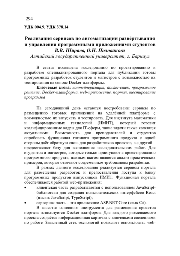На сегодняшний день остаются востребованы сервисы по размещению готовых приложений на удалённой платформе с возможностью их запускать и тестировать. Для института математики и информационных технологий (ИМИТ), который готовит квалифицированные кадры для IT-сферы, такие задачи также являются актуальными. Возможность для преподавателей и студентов опробовать функционал готового программного продукта с одной стороны даёт обратную связь для разработчиков проектов, а с другой – предоставляет базу для выполнения исследовательских работ. Для студентов и магистров, которые только приступают к проектированию программного продукта, важным шагом является анализ практических примеров, которые отвечают современным требованиям разработки.