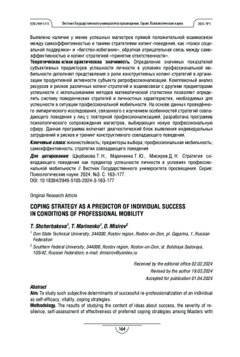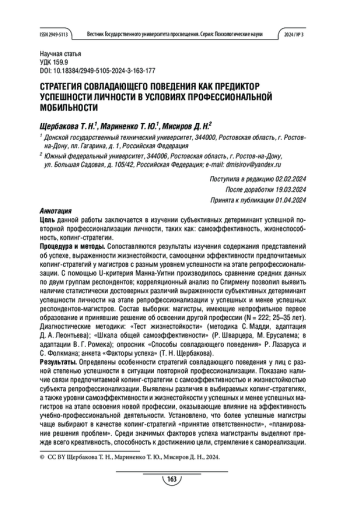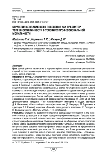 Результаты. Определены особенности стратегий совладающего поведения у лиц с разной степенью успешности в ситуации повторной профессионализации. Показано наличие связи предпочитаемой копинг-стратегии с самоэффективностью и жизнестойкостью субъекта репрофессионализации. Выявлены различия в выбираемых копинг-стратегиях, а также уровни самоэффективности и жизнестойкости у успешных и менее успешных магистров на этапе освоения новой профессии, оказывающие влияние на эффективность учебно-профессиональной деятельности. Установлено, что более успешные магистры чаще выбирают в качестве копинг-стратегий «принятие ответственности», «планирование решения проблем». Среди значимых факторов успеха магистранты выделяют прежде всего креативность, способность к достижению цели, стремление к самореализации. Выявлено наличие у менее успешных магистров прямой положительной взаимосвязи между самоэффективностью и такими стратегиями копинг-поведения, как «поиск социальной поддержки» и «бегство-избегание», обратная отрицательная связь между самоэффективностью и копинг-стратегией «принятие ответственности». Теоретическая и/или практическая значимость. Определение значимых показателей субъективных предикторов успешности личности в условиях профессиональной мобильности дополняет представления о роли конструктивных копинг-стратегий в организации продуктивной активности субъекта репрофессионализации. Комплексный анализ ресурсов и рисков различных копинг-стратегий и взаимосвязи с другими предикторами успешности с использованием методов математической статистики позволяет определить систему поведенческих стратегий и личностных характеристик, необходимых для успешности в ситуации профессиональной мобильности. На основе данных проведённого эмпирического исследования, связанного с изучением особенностей стратегий совладающего поведения у лиц с повторной профессионализацией, разработана программа психологического сопровождения магистров, выбирающих новую профессиональную сферу. Данная программа включает диагностический блок выявления индивидуальных затруднений и рисков и тренинг конструктивного совладающего поведения.