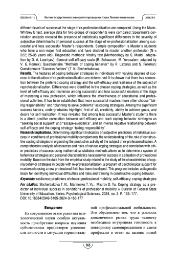Процедура и методы. Сопоставляются результаты изучения содержания представлений об успехе, выраженности жизнестойкости, самооценки эффективности предпочитаемых копинг-стратегий у магистров с разным уровнем успешности на этапе репрофессионализации. С помощью U-критерия Манна-Уитни производилось сравнение средних данных по двум группам респондентов; корреляционный анализ по Спирмену позволил выявить наличие статистически достоверных различий выраженности субъективных детерминант успешности личности на этапе репрофессионализации у успешных и менее успешных респондентов-магистров. Состав выборки: магистры, имеющие непрофильное первое образование и принявшие решение об освоении другой профессии (N = 222; 25–35 лет). Диагностические методики: «Тест жизнестойкости» (методика С. Мадди, адаптация Д. А. Леонтьева); «Шкала общей самоэффективности» (Р. Шварцера, М. Ерусалема; в адаптации В. Г. Ромека); опросник «Способы совладающего поведения» Р. Лазаруса и С. Фолкмана; анкета «Факторы успеха» (Т. Н. Щербакова).