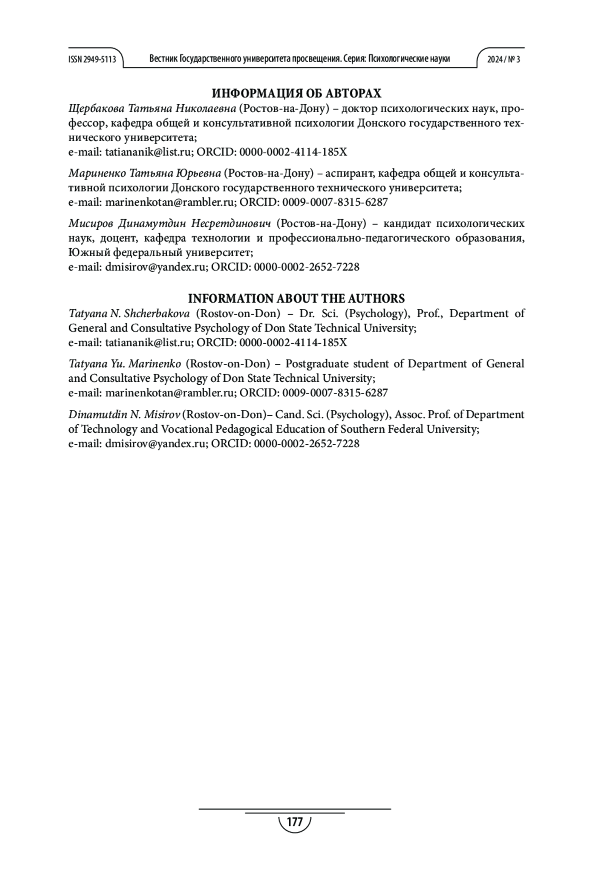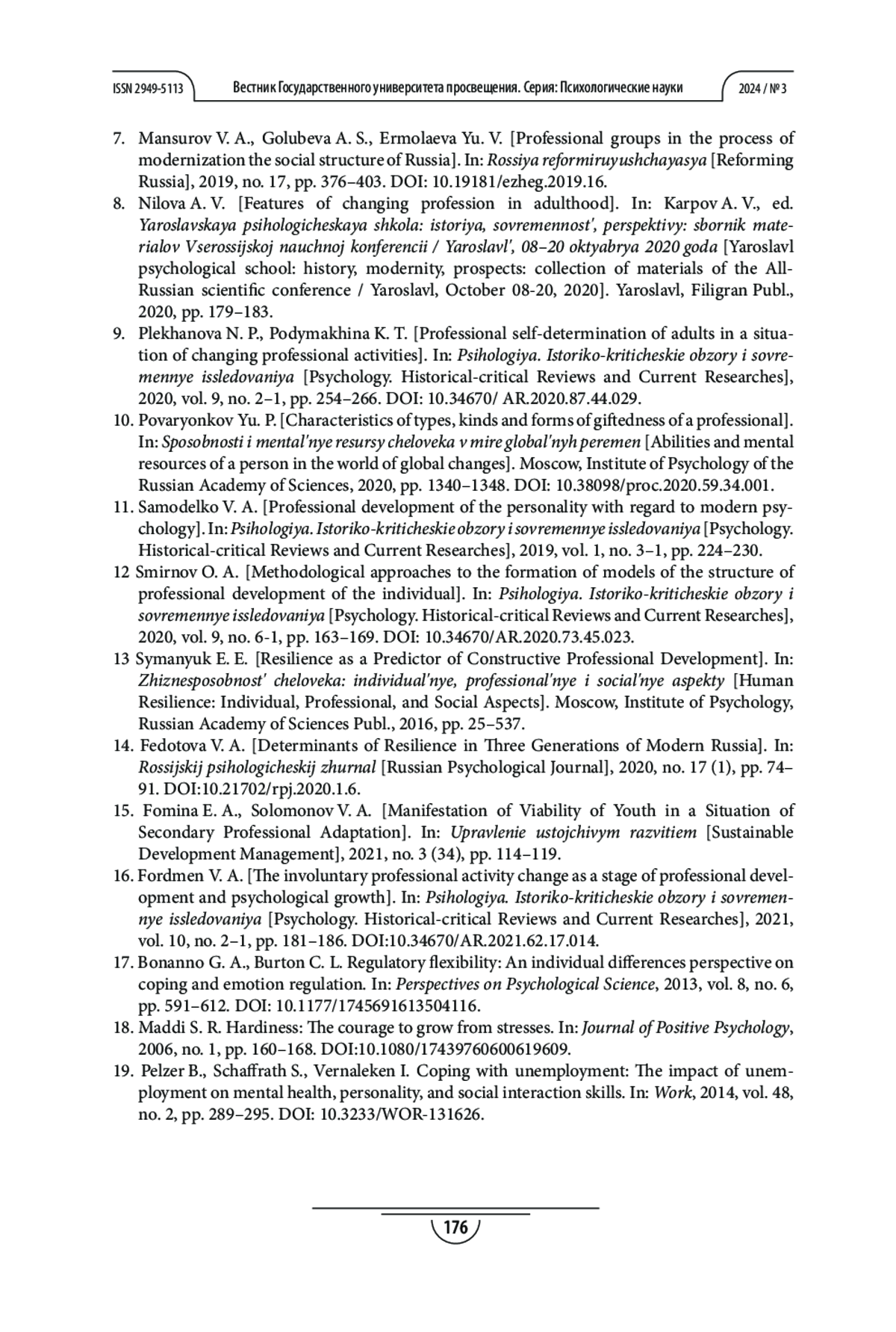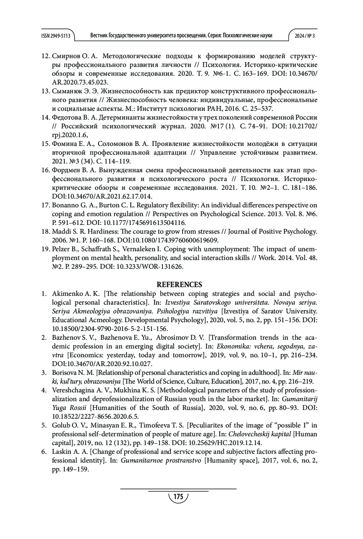 Цель данной работы заключается в изучении субъективных детерминант успешной повторной профессионализации личности, таких как: самоэффективность, жизнеспособность, копинг-стратегии.