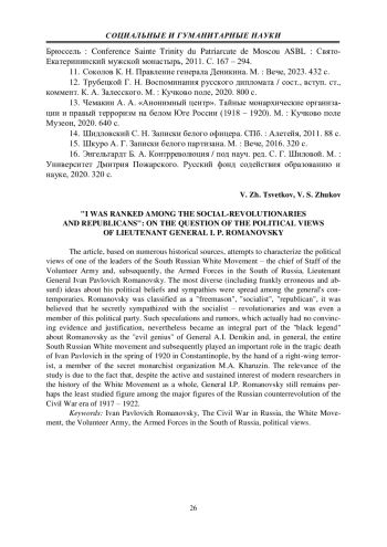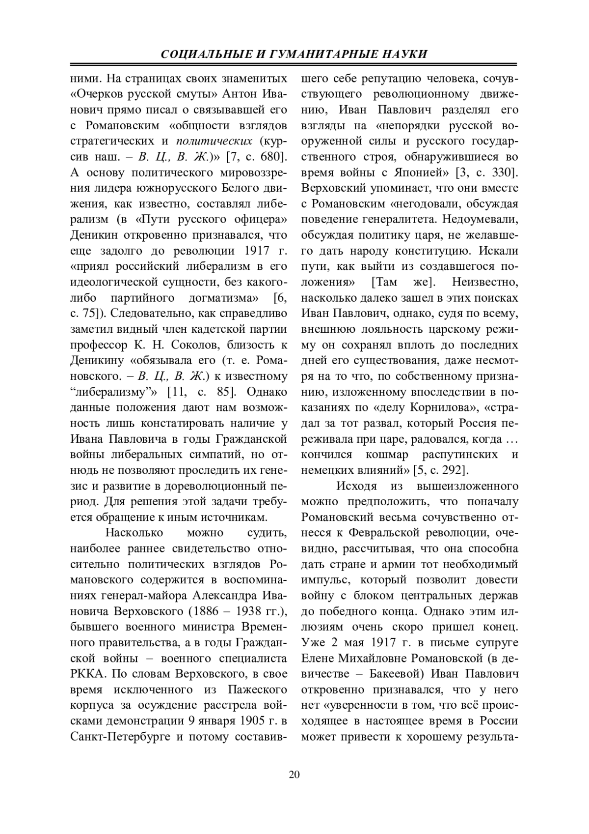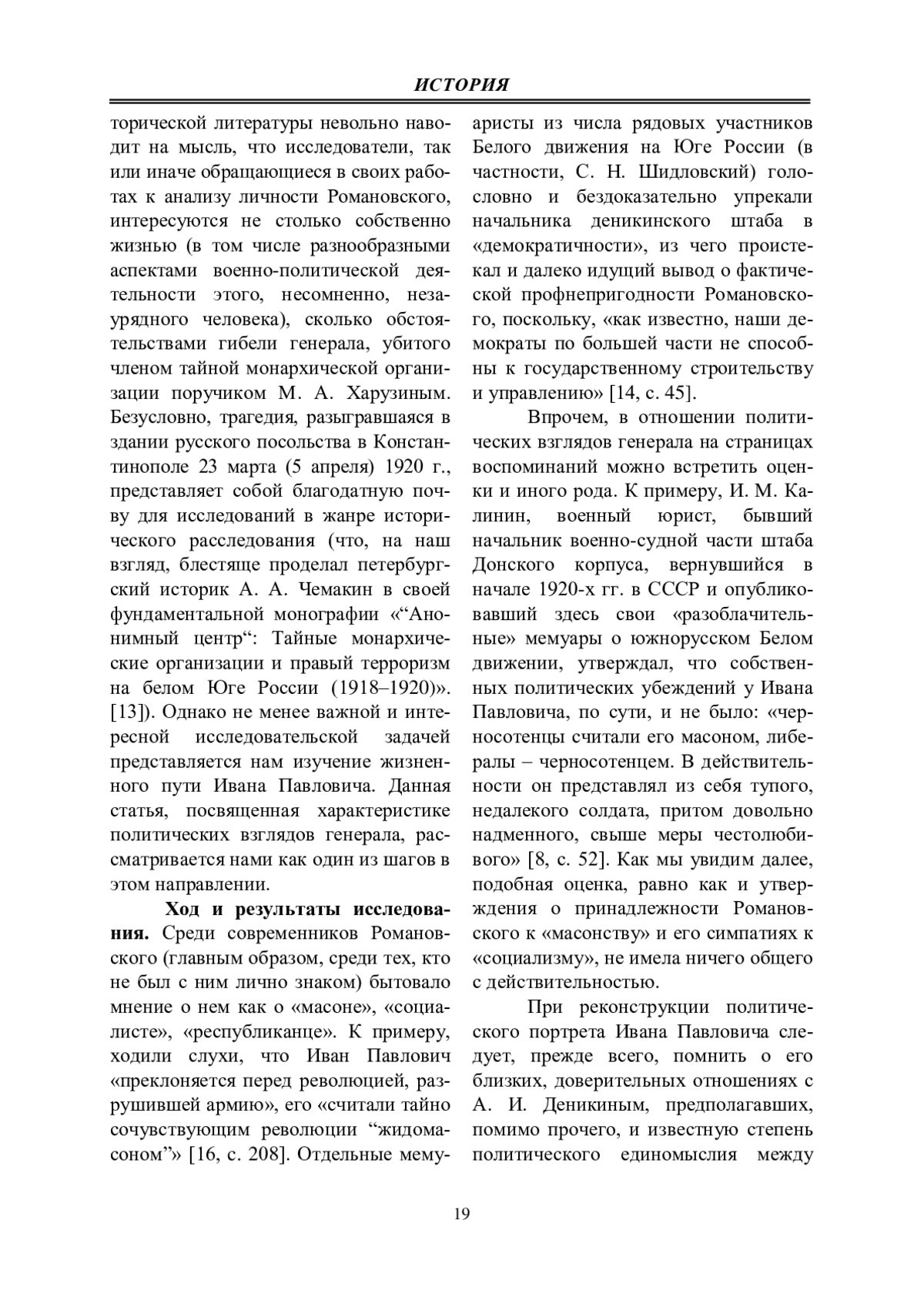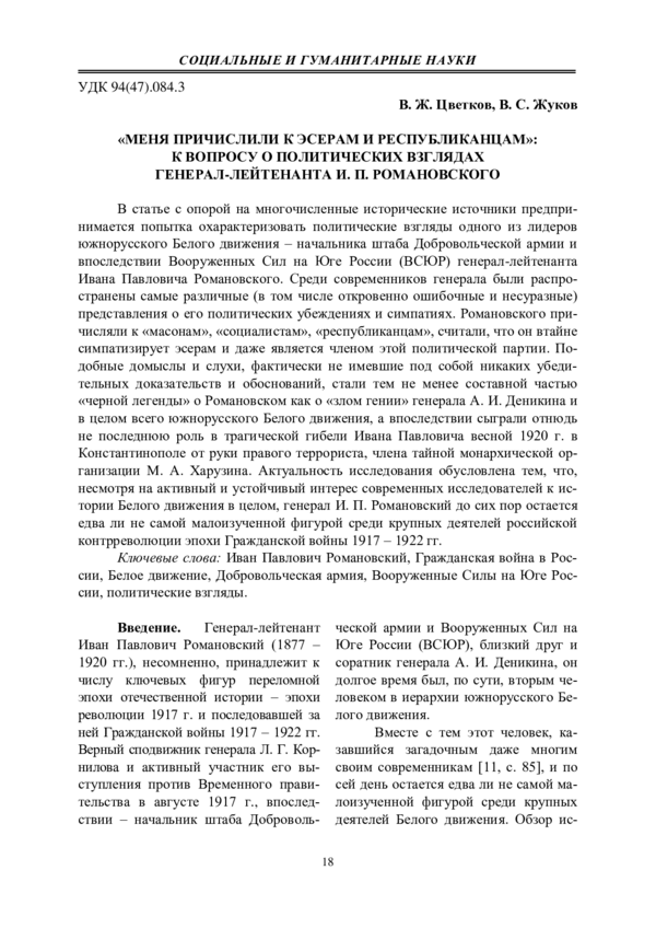 В статье с опорой на многочисленные исторические источники предпринимается попытка охарактеризовать политические взгляды одного из лидеров южнорусского Белого движения - начальника штаба Добровольческой армии и впоследствии Вооруженных Сил на Юге России (ВСЮР) генерал-лейтенанта Ивана Павловича Романовского. Среди современников генерала были распространены самые различные (в том числе откровенно ошибочные и несуразные) представления о его политических убеждениях и симпатиях. Романовского причисляли к «масонам», «социалистам», «республиканцам», считали, что он втайне симпатизирует эсерам и даже является членом этой политической партии. Подобные домыслы и слухи, фактически не имевшие под собой никаких убедительных доказательств и обоснований, стали тем не менее составной частью «черной легенды» о Романовском как о «злом гении» генерала А. И. Деникина и в целом всего южнорусского Белого движения, а впоследствии сыграли отнюдь не последнюю роль в трагической гибели Ивана Павловича весной 1920 г. в Константинополе от руки правого террориста, члена тайной монархической организации М. А. Харузина. Актуальность исследования обусловлена тем, что, несмотря на активный и устойчивый интерес современных исследователей к истории Белого движения в целом, генерал И. П. Романовский до сих пор остается едва ли не самой малоизученной фигурой среди крупных деятелей российской контрреволюции эпохи Гражданской войны 1917 - 1922 гг.