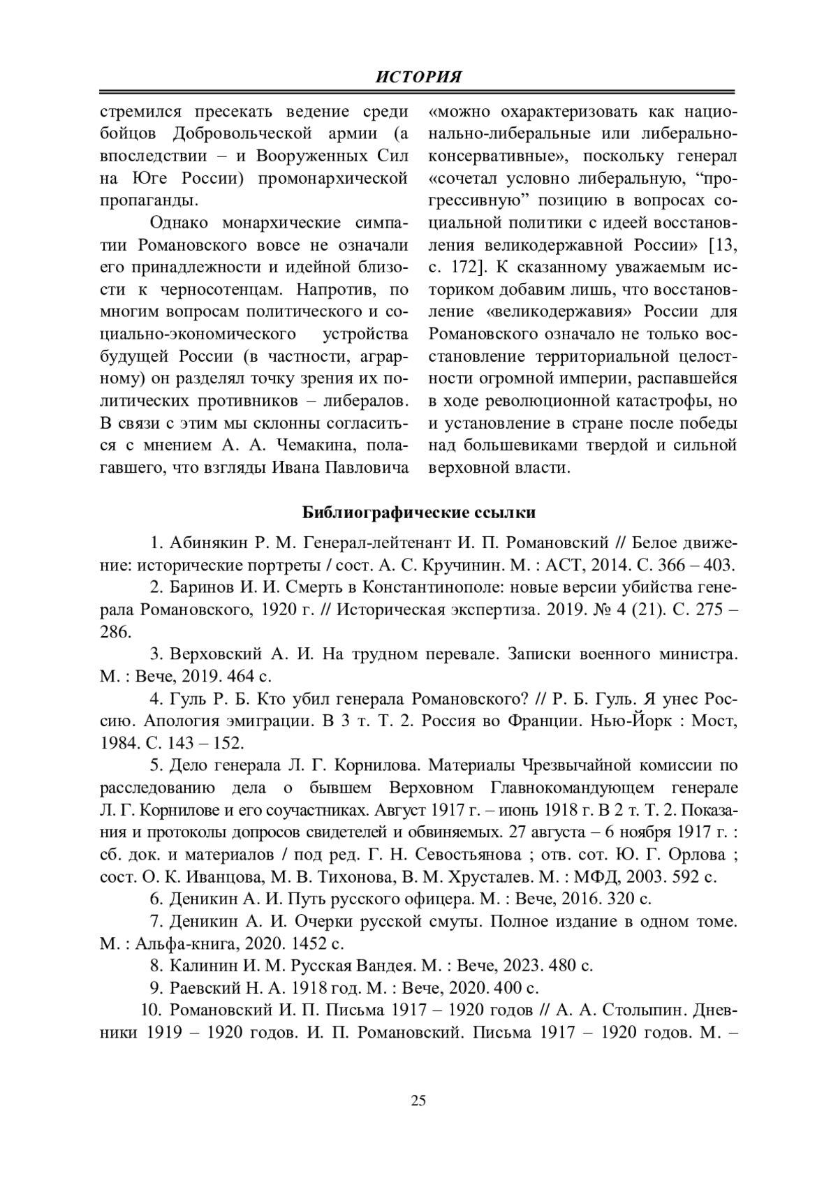 2. Баринов И. И. Смерть в Константинополе: новые версии убийства генерала Романовского, 1920 г. // Историческая экспертиза. 2019. № 4 (21). С. 275 - 286. EDN: URRPYW
