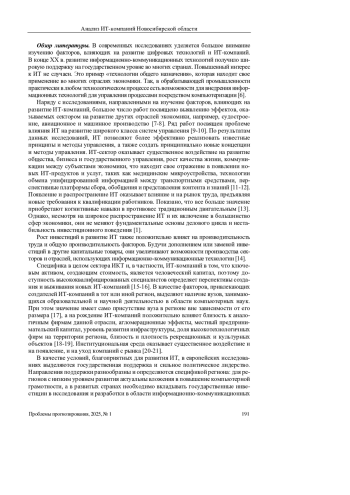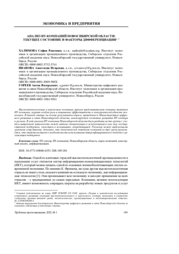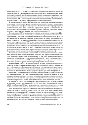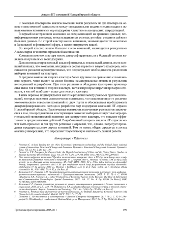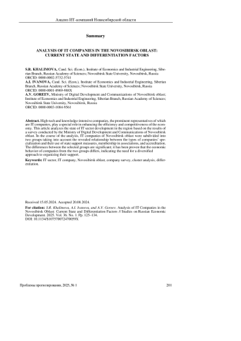 ХАЛИМОВА С. Р., ИВАНОВА А. И., ГОРЕЕВ А. В. АНАЛИЗ ИТ-КОМПАНИЙ НОВОСИБИРСКОЙ ОБЛАСТИ: ТЕКУЩЕЕ СОСТОЯНИЕ И ФАКТОРЫ ДИФФЕРЕНЦИАЦИИ1, 2 // ПРОБЛЕМЫ ПРОГНОЗИРОВАНИЯ. 2025. № 1 (208)