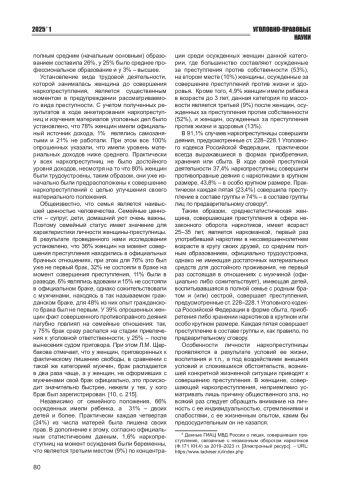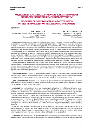В современном обществе женщины все активнее участвуют в незаконном обороте наркотиков, причем в наркопреступлениях они не только второстепенные участницы, но и нередко выступают на первых, ключевых ролях. Преступность среди лиц женского пола, связанная с незаконным оборотом наркотических средств и психотропных веществ, получила широкую распространенность в большинстве регионов Российской Федерации, а ее предупреждение стало актуальной проблемой для науки и практики. В незаконный оборот наркотиков вовлекается все большее количество женщин молодого и несовершеннолетнего возраста - студенток, учащихся колледжей, профессионально-технических училищ и даже школьниц. Однако эффективность работы по профилактике женской преступности в сфере незаконного оборота наркотиков оставляет желать лучшего. Доля женщин-преступниц в общем количестве правонарушителей с каждым годом растет. Исследования в области женской наркопреступности являются ценной информацией для специалистов, занимающихся профилактикой наркопреступлений и наркомании. На основе анализа, проведенного автором исследования, определяется понятие личности женщины-наркопреступницы, выявляются основные социально-демографические характеристики личности женщин, совершивших наркопреступления (возраст на момент совершения преступления, источник дохода, семейное положение, наличие детей, образование), составляется среднестатистический портрет женщины-наркопреступницы.
