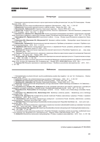 12. Смолина Т.А. Женская преступность, связанная с незаконным оборотом наркотических средств (по материалам Тюменской области): дис. … канд. юрид. наук. - Тюмень, 2005. - 257 с. EDN: NNKERR