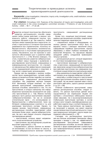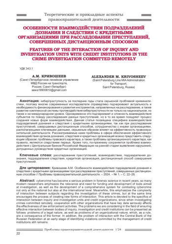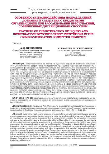 Киберпреступность за последние годы стала серьезной проблемой криминалистики, поэтому многие современные исследователи справедливо подчеркивают актуальность и необходимость финансирования и развития инструментов, направленных на расследование, а также развитие комплексной системы противодействия киберпреступности не только на национальном, но также и на международном уровне. Одновременно это подчеркивает и сложность взаимодействия субъектов по поводу расследования данных преступлений, но в то же время поощряет процесс создания новых форм взаимодействия. Данная статья посвящена специфике взаимодействия подразделений дознания и следствия с кредитными организациями, так как при расследовании преступлений, совершаемых дистанционным способом, сотрудничество с иными организациями, располагающими ключевыми данными, серьезным образом влияет на эффективность правоохранительной деятельности. Рассматриваемые нами проблемы в сфере обеспечения эффективного взаимодействия органов дознания, следствия и кредитных организаций можно представить следующим образом: проблемы правового характера, а также проблемы организационного характера, как правило, являются следствием первых. Кроме того, по-прежнему сохраняется проблема взаимодействия с Центральным банком Российской Федерации на ранней стадии выявления нарушений, допущенных руководством кредитных организаций.