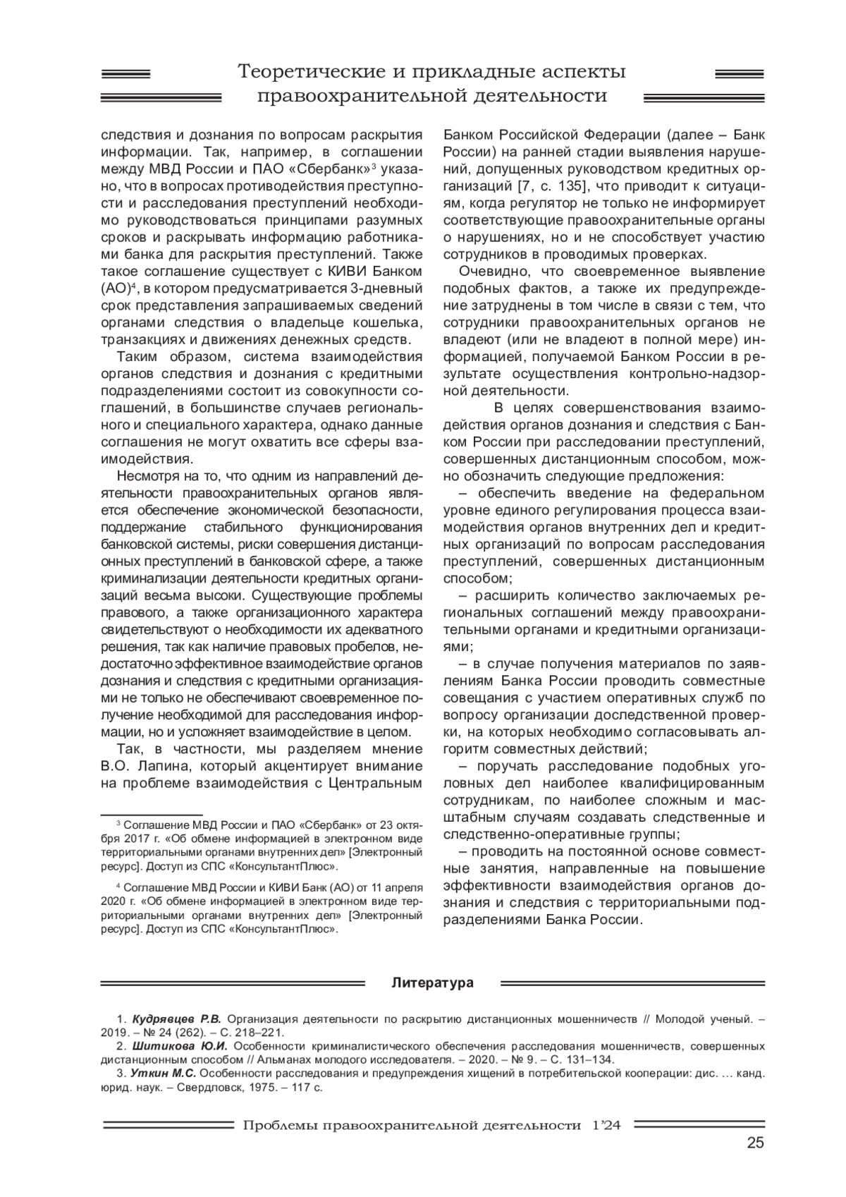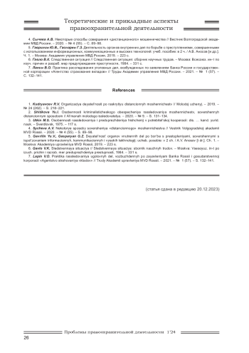 1. Кудрявцев Р.В. Организация деятельности по раскрытию дистанционных мошенничеств // Молодой ученый. - 2019. - № 24 (262). - С. 218-221. EDN: OIIYJF