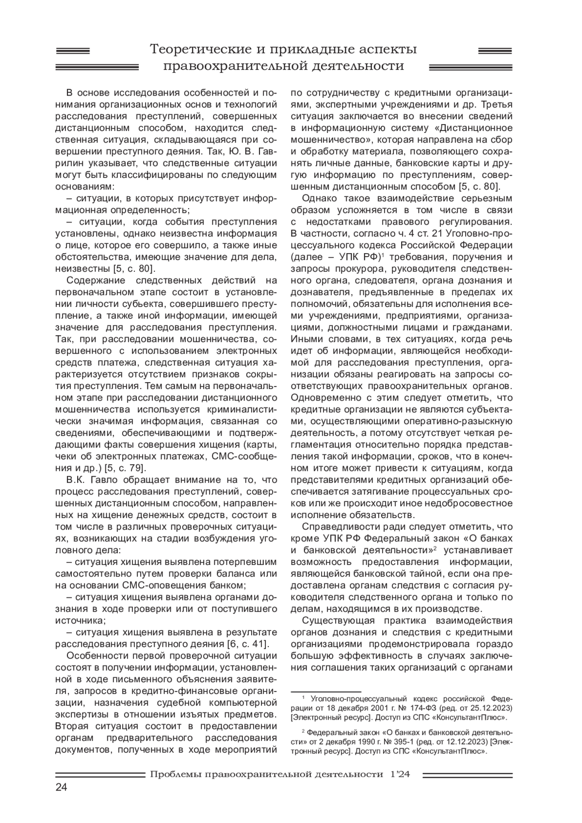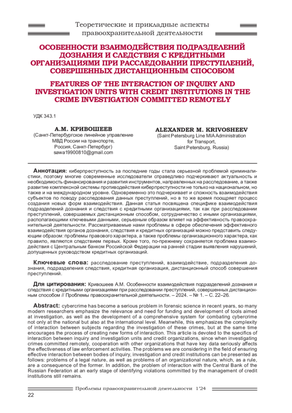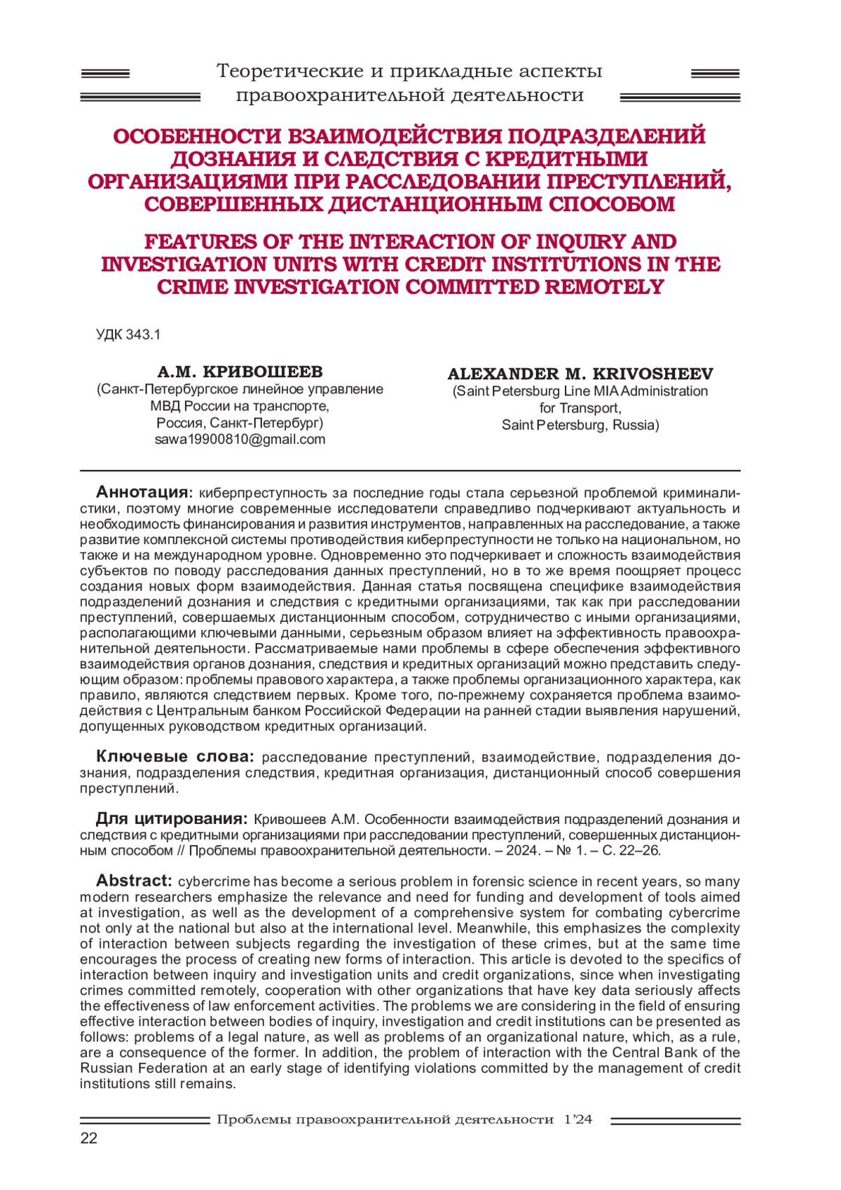 Развитие интернет-пространства обеспечило развитие дистанционного способа совершения любых видов действий, а именно: возможность работы, совершения покупок, прохождения обучения и др. Как известно, любой прогресс имеет преимущества и недостатки, поэтому и преступность в интернет-пространстве развивается все стремительнее, поскольку киберпреступность обусловлена анонимностью, глобальностью и отсутствием юрисдикционных границ. Несомненно, все эти признаки в совокупности обеспечивают рост и развитие киберпреступности [1, с. 218]. Вполне очевидно, что столь стремительное развитие киберпространства требует новых подходов к выявлению и расследованию преступлений, совершаемых в информационном пространстве, что становится невозможным без эффективного взаимодействия подразделений дознания и следствия, в том числе с кредитными организациями.