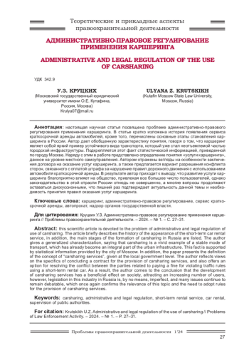 Настоящая научная статья посвящена проблеме административно-правового регулирования применения каршеринга. В статье кратко изложена история появления сервиса краткосрочной аренды автомобилей, кроме того, перечислены основные этапы становления каршеринга в России. Автор дает обобщенную характеристику понятия, говоря о том, что каршеринг являет собой яркий пример устойчивого вида транспорта, который уже стал неотъемлемой частью городской инфраструктуры. Подкрепляется этот факт статистической информацией, приведенной по городу Москве. Наряду с этим в работе представлено определение понятия «услуги каршеринга», данное на уровне местного самоуправления. Автором отражены взгляды на особенности заключения договора на оказание услуг каршеринга, а также предлагается вариант разрешения конфликта сторон, связанного с оплатой штрафа за нарушение правил дорожного движения с использованием автомобиля краткосрочной аренды. В результате автор приходит к выводу, что развитие услуги каршеринга благоприятно влияет на общество, привлекая все большее число пользователей, однако законодательство в этой отрасли России отнюдь не совершенно, а многие вопросы продолжают оставаться дискуссионными, что лишний раз подтверждает актуальность данной темы и необходимость принятия правил оказания услуг каршеринга.