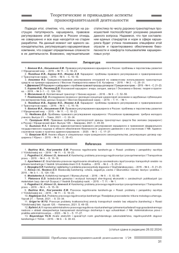1. Бажина М.А., Косьяненко Е.М. Правовое регулирование каршеринга в России: проблемы и перспективы развития // Юридический мир. - 2019. - № 11. - С. 18-23. EDN: YBYWDB