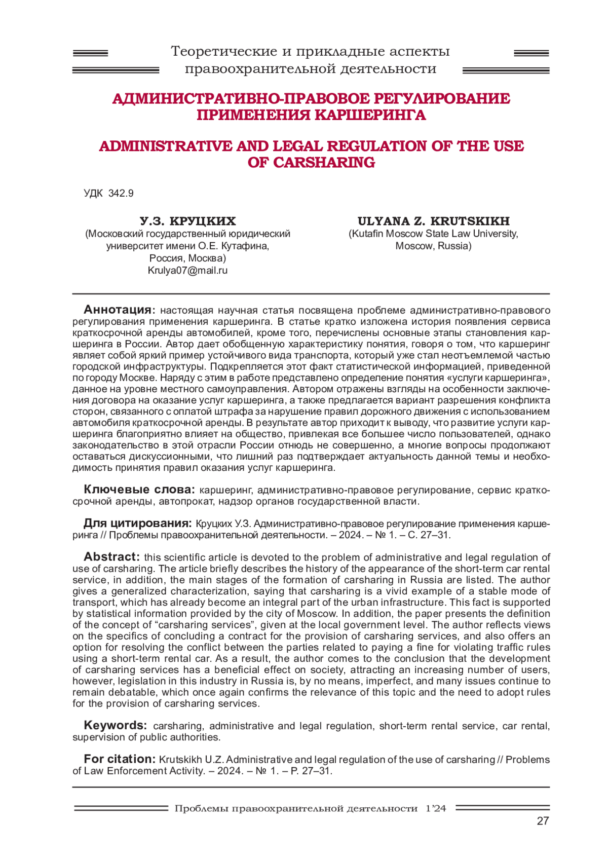 10. Нагдалян Д.А. Проблемы правового регулирования каршеринга / Российское правоведение: трибуна молодого ученого. Выпуск 21. - Томск, 2021. - С. 33-34.