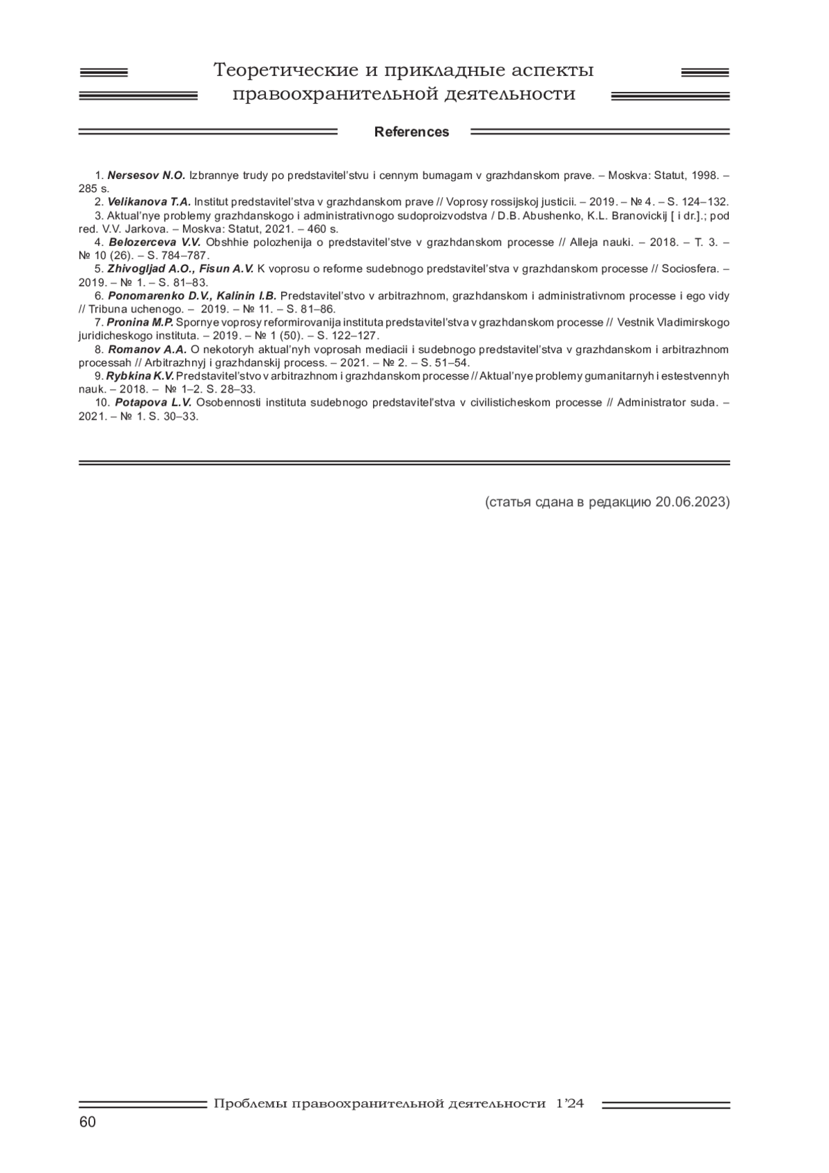 7. Пронина М.П. Спорные вопросы реформирования института представительства в гражданском процессе // Вестник Владимирского юридического института. - 2019. - № 1 (50). - С. 122-127. EDN: ZARJGP