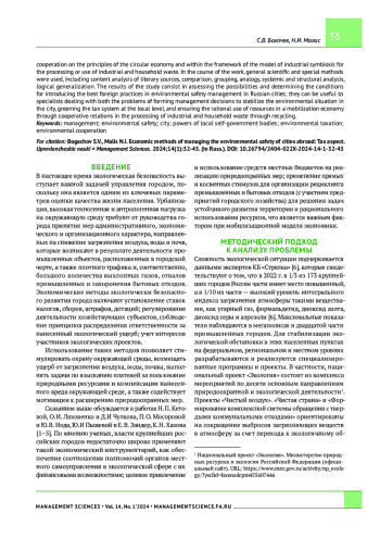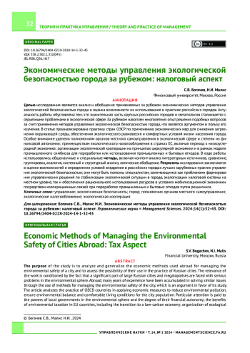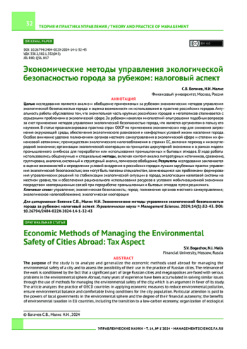 Целью исследования являются анализ и обобщение применяемых за рубежом экономических методов управления экологической безопасностью города и оценка возможности их использования в практике российских городов. Актуальность работы обусловлена тем, что значительная часть крупных российских городов и мегаполисов сталкивается с серьезными проблемами в экологической сфере. За рубежом накоплен многолетний опыт решения подобных вопросов за счет применения методов управления экологической безопасностью города, что является аргументом в пользу его изучения. В статье проанализирована практика стран ОЭСР по применению экономических мер для снижения загрязнения окружающей среды, обеспечения экологического равновесия и комфортных условий жизни населения города. Особое внимание уделено полномочиям органов местного самоуправления в экологической сфере и степени их финансовой автономии; преимуществам экологического налогообложения в странах ЕС, включая переход к низкоуглеродной экономике; организации экологической кооперации на принципах циркулярной экономики и в рамках модели промышленного симбиоза для переработки или использования промышленных и бытовых отходов. В ходе работы использовались общенаучные и специальные методы, включая контент-анализ литературных источников, сравнение, группировка, аналогия, системный и структурный анализ, логическое обобщение. Результаты исследования заключаются в оценке возможностей и определении условий внедрения в российских городах лучших зарубежных практик управления экологической безопасностью; они могут быть полезны специалистам, занимающимся как проблемами формирования управленческих решений по стабилизации экологической ситуации в городе, экологизации налоговой системы на местном уровне, так и обеспечения рационального использования ресурсов в условиях мобилизационной экономики посредством кооперационных связей при переработке промышленных и бытовых отходов путем рециклинга.
