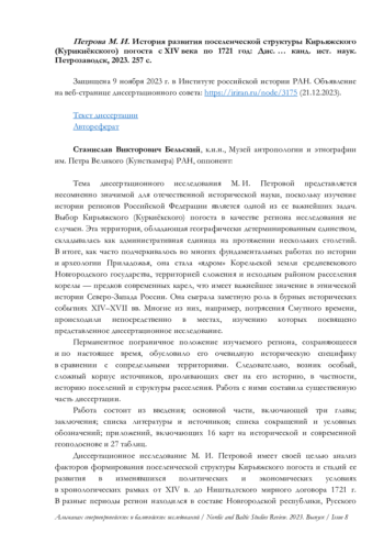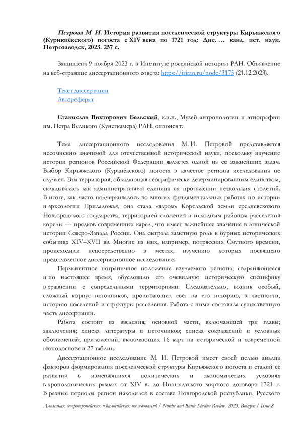 Тема диссертационного исследования М. И. Петровой представляется несомненно значимой для отечественной исторической науки, поскольку изучение истории регионов Российской Федерации является одной из ее важнейших задач. Выбор Кирьяжского (Куркиёкского) погоста в качестве региона исследования не случаен.