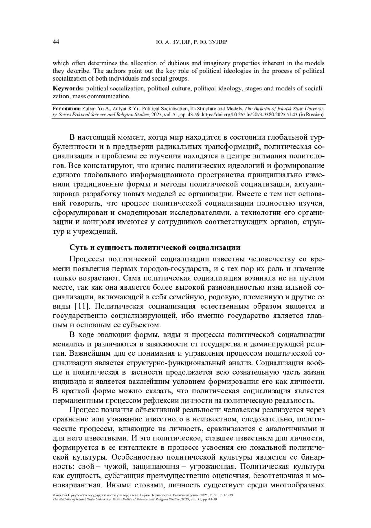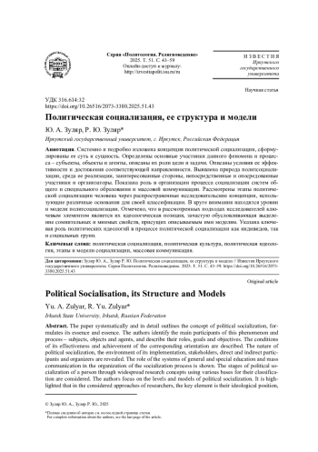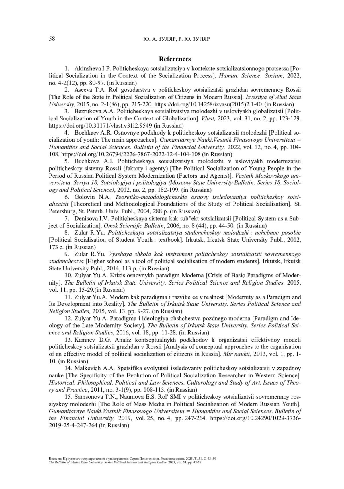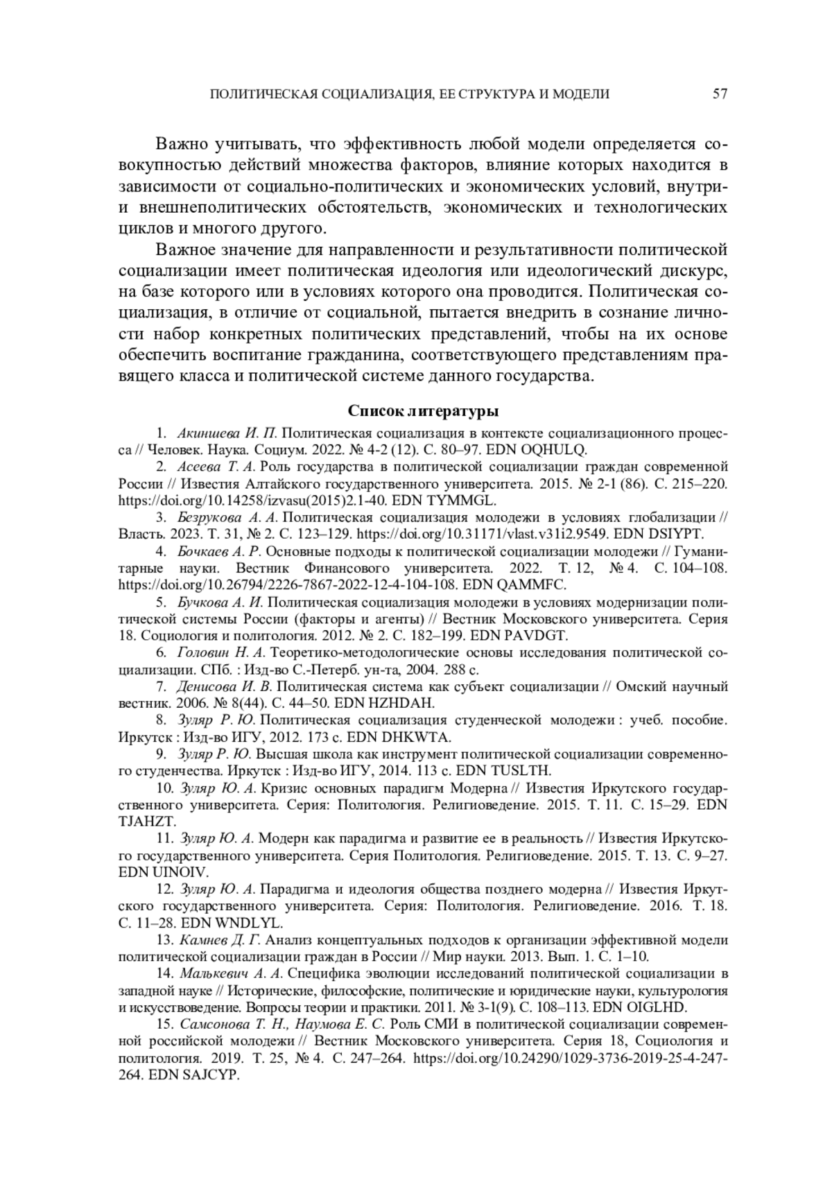 1. Акиншева И. П. Политическая социализация в контексте социализационного процесса // Человек. Наука. Социум. 2022. № 4-2 (12). С. 80-97. EDN: OQHULQ