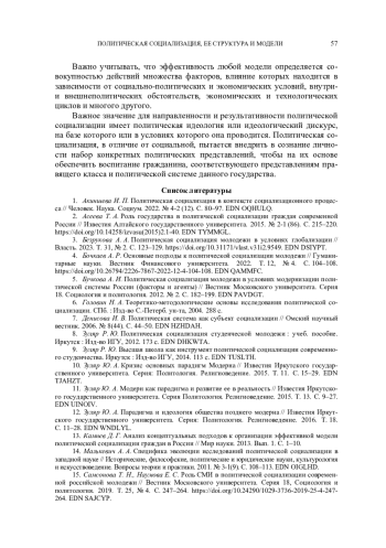 4. Бочкаев А. Р. Основные подходы к политической социализации молодежи // Гуманитарные науки. Вестник Финансового университета. 2022. Т. 12, № 4. С. 104-108. DOI: 10.26794/2226-7867-2022-12-4-104-108 EDN: QAMMFC