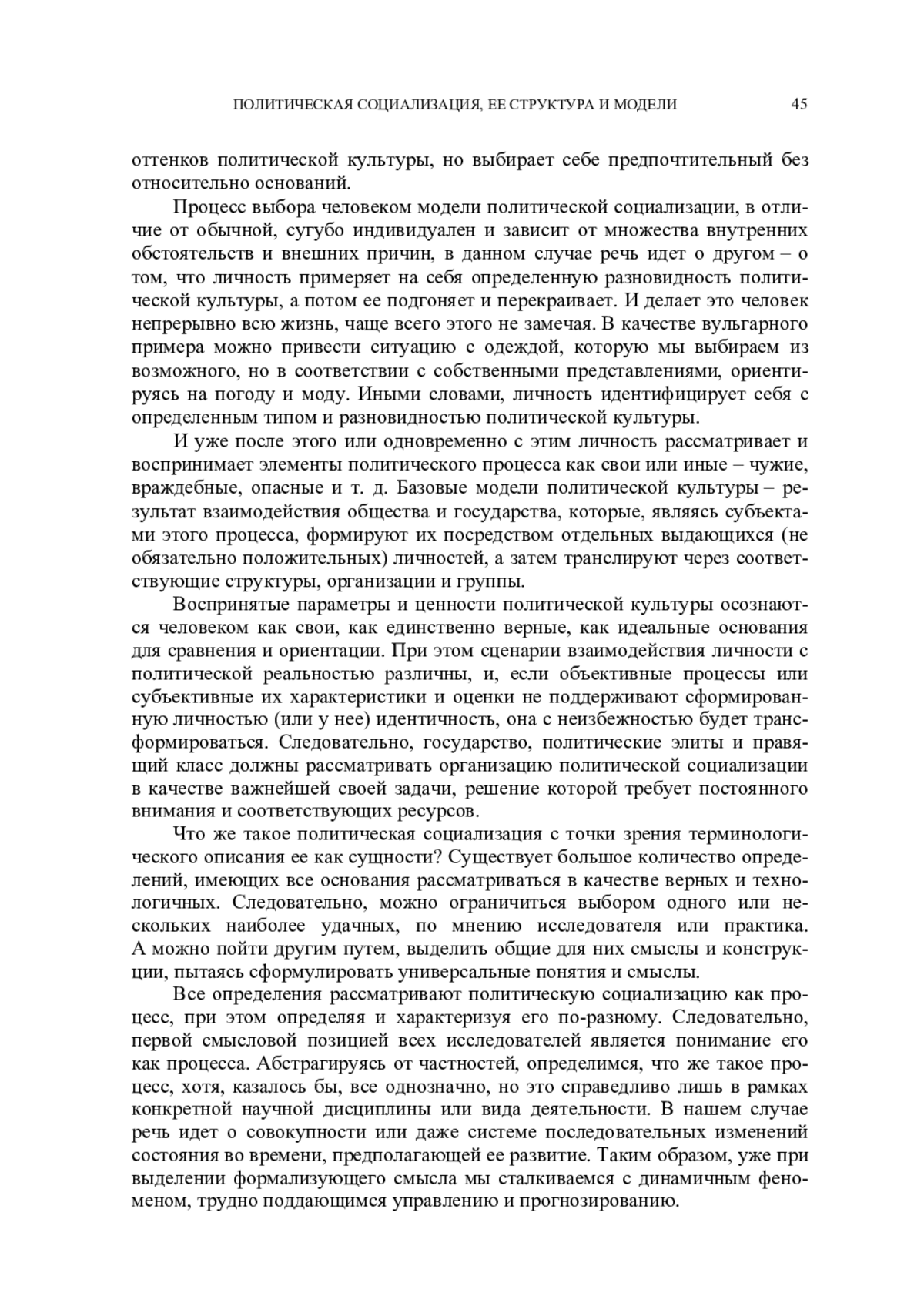 В настоящий момент, когда мир находится в состоянии глобальной турбулентности и в преддверии радикальных трансформаций, политическая социализация и проблемы ее изучения находятся в центре внимания политологов. Все констатируют, что кризис политических идеологий и формирование единого глобального информационного пространства принципиально изменили традиционные формы и методы политической социализации, актуализировав разработку новых моделей ее организации. Вместе с тем нет оснований говорить, что процесс политической социализации полностью изучен, сформулирован и смоделирован исследователями, а технологии его организации и контроля имеются у сотрудников соответствующих органов, структур и учреждений.