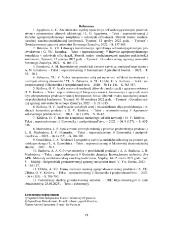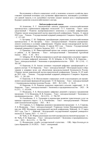 1. Агапитова, Л. Г. Аналитические аспекты управления сельскохозяйственным производством с применением цифровых технологий / Л. Г. Агапитова. - Текст: непосредственный // Развитие агропромышленного комплекса в условиях цифровизации. Сборник трудов международной научно-практической конференции, Тюмень, 12 апреля 2022 года. - Тюмень: Государственный аграрный университет Северного Зауралья, 2022. - С. 157-165. EDN: LAWWDS
