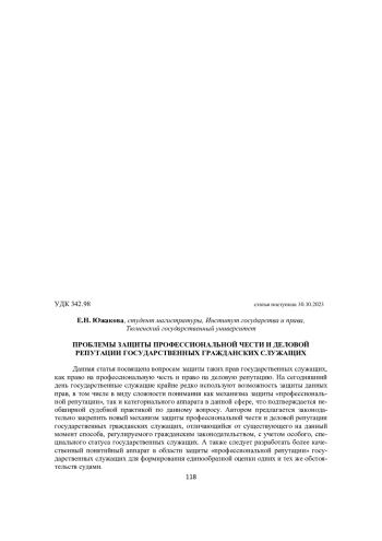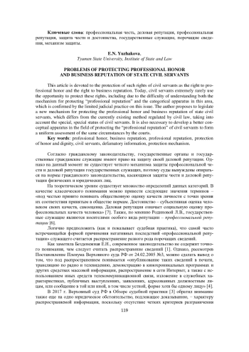 Данная статья посвящена вопросам защиты таких прав государственных служащих, как право на профессиональную честь и право на деловую репутацию. На сегодняшний день государственные служащие крайне редко используют возможность защиты данных прав, в том числе в виду сложности понимания как механизма защиты «профессиональной репутации», так и категориального аппарата в данной сфере, что подтверждается необширной судебной практикой по данному вопросу. Автором предлагается законодательно закрепить новый механизм защиты профессиональной чести и деловой репутации государственных гражданских служащих, отличающийся от существующего на данный момент способа, регулируемого гражданским законодательством, с учетом особого, специального статуса государственных служащих. А также следует разработать более качественный понятийный аппарат в области защиты «профессиональной репутации» государственных служащих для формирования единообразной оценки одних и тех же обстоятельств судами.