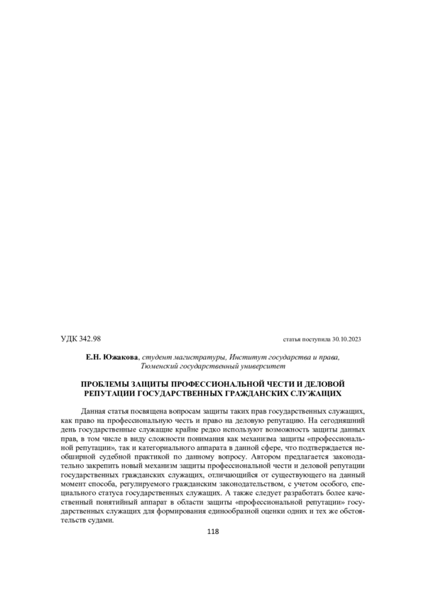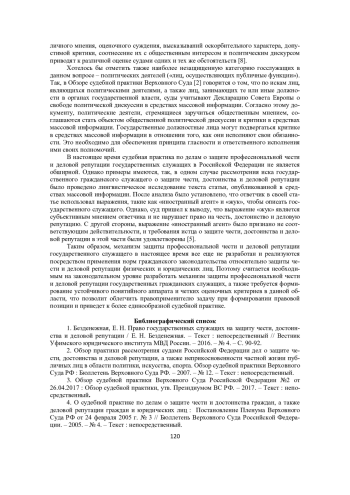 1. Безденежная, Е. Н. Право государственных служащих на защиту чести, достоинства и деловой репутации / Е. Н. Безденежная. - Текст: непосредственный // Вестник Уфимского юридического института МВД России. - 2016. - № 4. - С. 90-92.