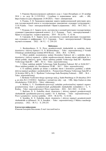 6. Родина, Л. В. Гражданско-правовая защита профессиональной репутации органов государственной власти и государственных гражданских служащих (сотрудников) / Л. В. Родина. - Текст: непосредственный // Право и управление. - 2022. - № 8. 2022. - С. 63-66. EDN: SXEOSE