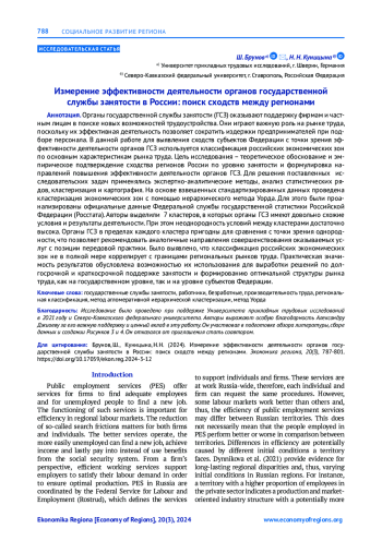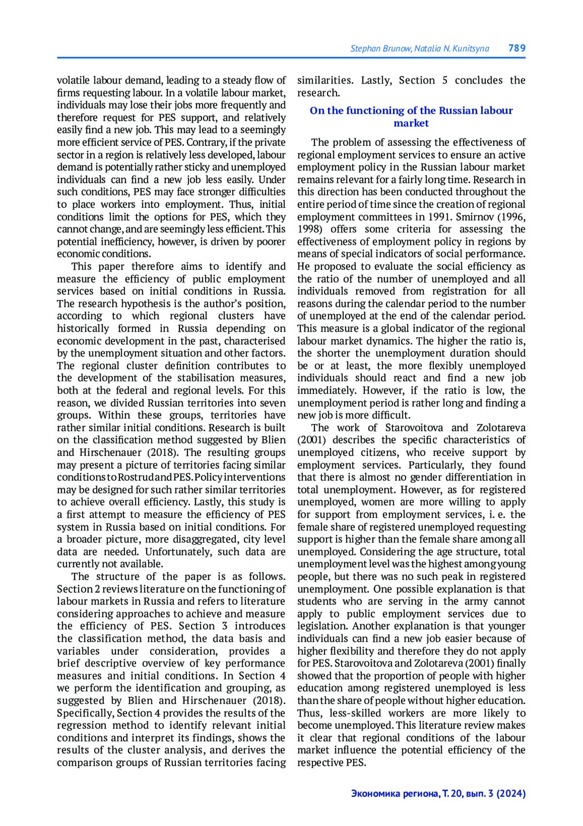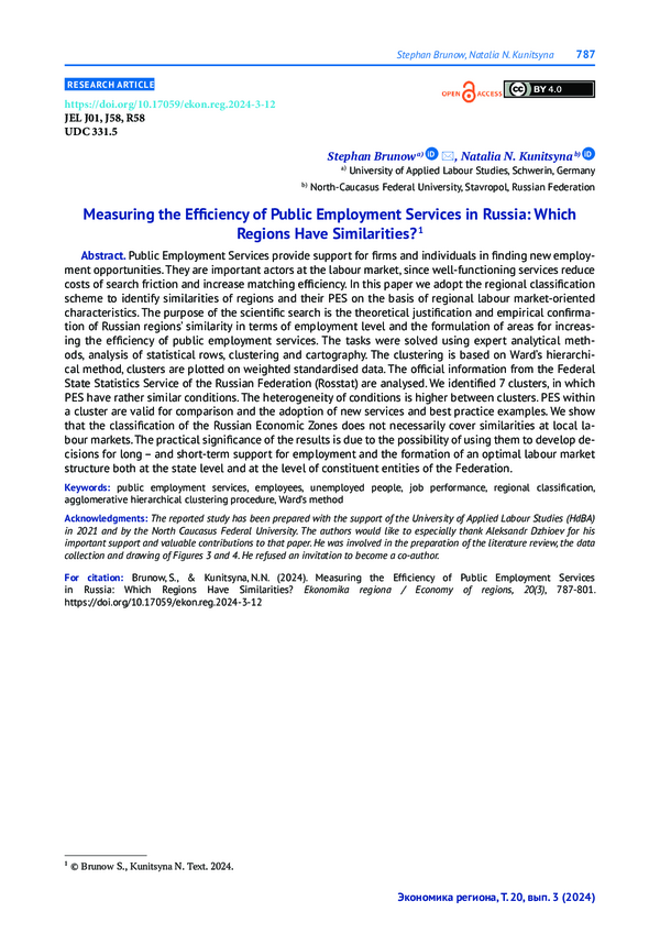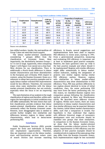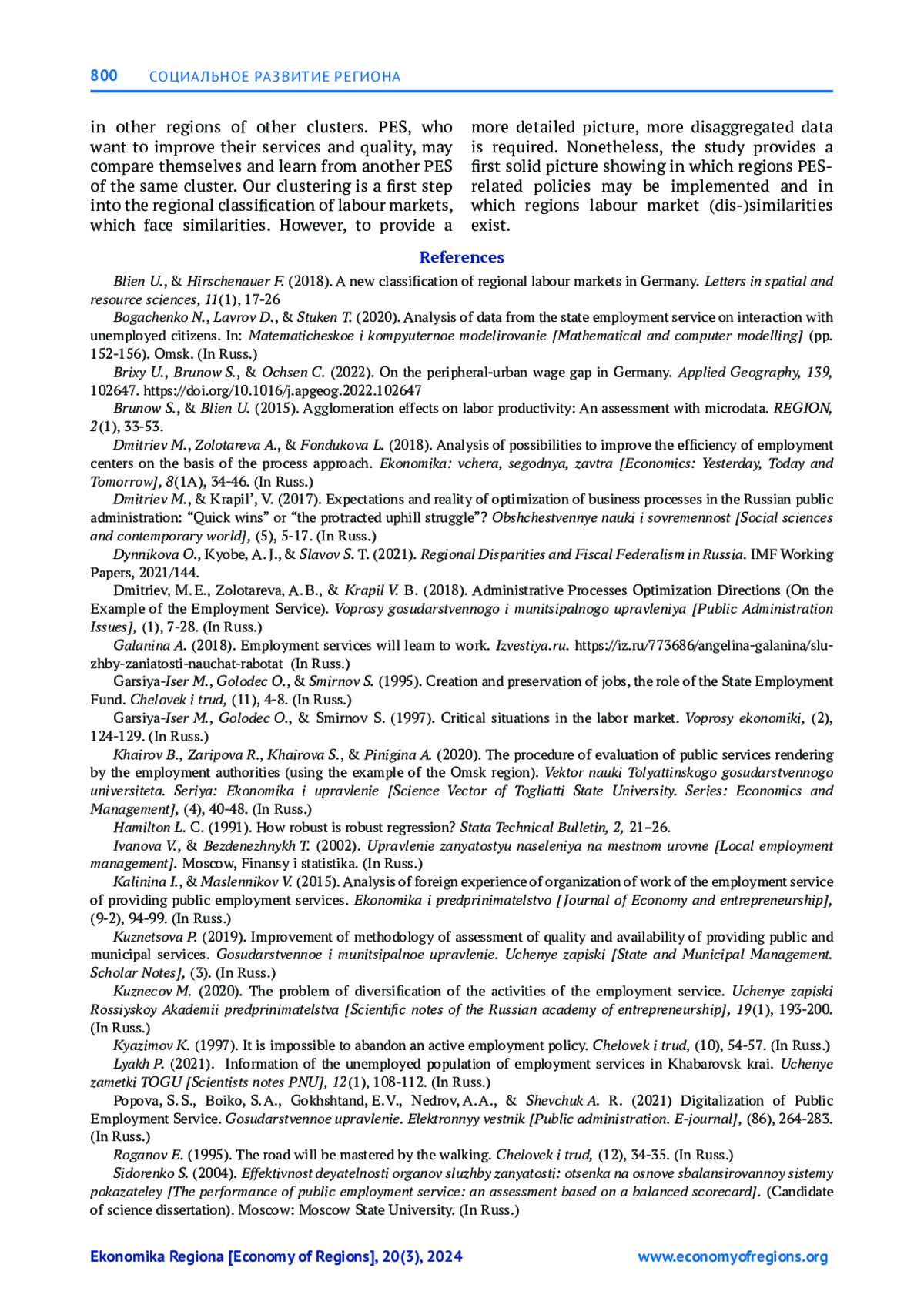 Public Employment Services provide support for firms and individuals in finding new employment opportunities. They are important actors at the labour market, since well-functioning services reduce costs of search friction and increase matching efficiency. In this paper we adopt the regional classification scheme to identify similarities of regions and their PES on the basis of regional labour market-oriented characteristics. The purpose of the scientific search is the theoretical justification and empirical confirmation of Russian regions’ similarity in terms of employment level and the formulation of areas for increasing the efficiency of public employment services. The tasks were solved using expert analytical methods, analysis of statistical rows, clustering and cartography. The clustering is based on Ward’s hierarchical method, clusters are plotted on weighted standardised data. The official information from the Federal State Statistics Service of the Russian Federation (Rosstat) are analysed. We identified 7 clusters, in which PES have rather similar conditions. The heterogeneity of conditions is higher between clusters. PES within a cluster are valid for comparison and the adoption of new services and best practice examples. We show that the classification of the Russian Economic Zones does not necessarily cover similarities at local labour markets. The practical significance of the results is due to the possibility of using them to develop decisions for long - and short-term support for employment and the formation of an optimal labour market structure both at the state level and at the level of constituent entities of the Federation.