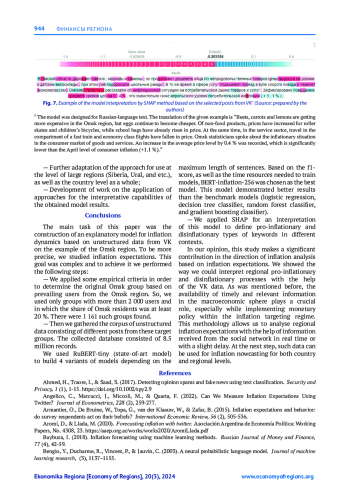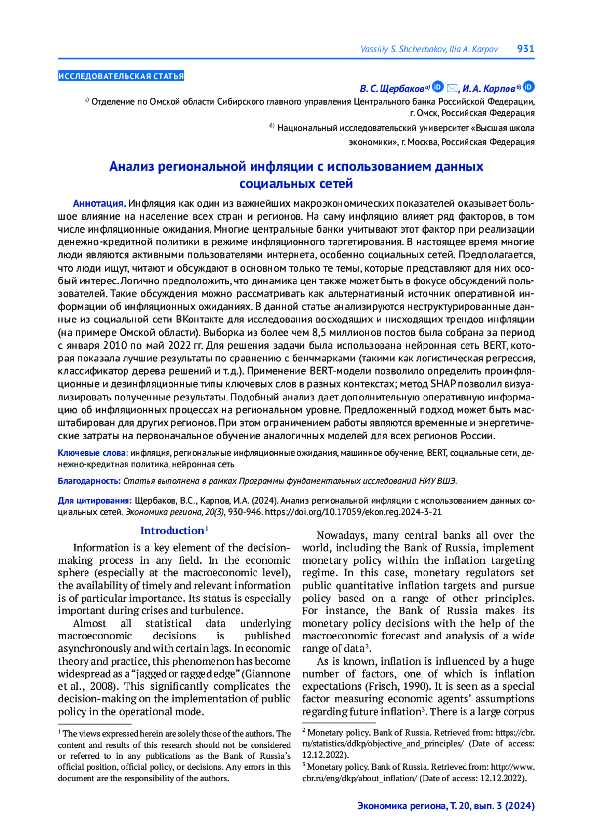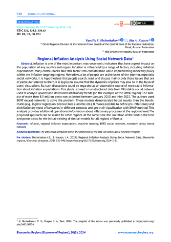 Inflation is one of the most important macroeconomic indicators that have a great impact on the population of any country and region. Inflation is influenced by a range of factors, including inflation expectations. Many central banks take this factor into consideration while implementing monetary policy within the inflation targeting regime. Nowadays, a lot of people are active users of the Internet, especially social networks. It is hypothesised that people search, read, and discuss mainly only those issues that are of particular interest to them. It is logical to assume that the dynamics of prices may also be in the focus of users’ discussions. So, such discussions could be regarded as an alternative source of more rapid information about inflation expectations. This study is based on unstructured data from VKontakte social network used to analyse upward and downward inflationary trends (on the example of the Omsk region). The sample of more than 8.5 million posts was collected between January 2010 and May 2022. The authors used BERT neural networks to solve the problem. These models demonstrated better results than the benchmarks (e. g., logistic regression, decision tree classifier, etc.). It makes possible to define pro-inflationary and disinflationary types of keywords in different contexts and get their visualisation with SHAP method. This analysis provides additional operational information about inflationary processes at the regional level The proposed approach can be scaled for other regions. At the same time, the limitation of the work is the time and power costs for the initial training of similar models for all regions of Russia.
