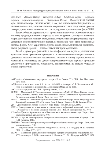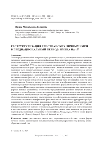 23. Ганжина И. М. Реструктуризация христианских личных имtн в преднациональный период: имена на -а, -ия // Вопросы ономастики. 2013. Т. 15, № 2. С. 128-136. EDN: RSDDZX