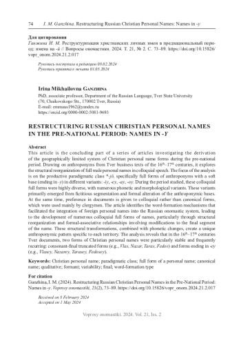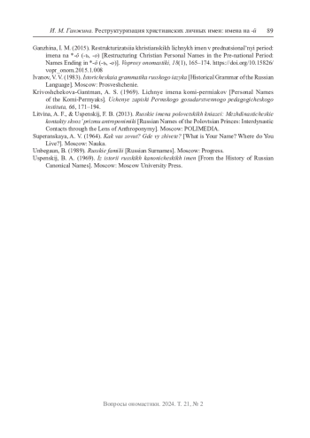 24. Ганжина И. М. Реструктуризация христианских личных имен в преднациональный период: имена на *-ŏ (-ъ, -о) // Вопросы ономастики. 2015. Т. 18, № 1. С. 165-174. DOI: 10.15826/vopr_onom.2015.1.008 EDN: UABCQF