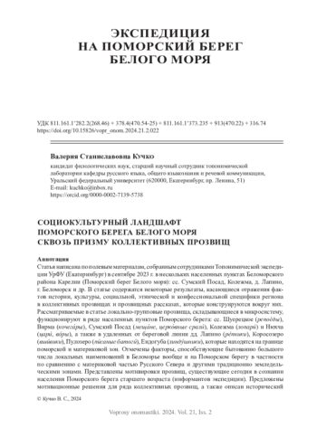 Осенью 2023 г. автор этой статьи в составе экспедиции Уральского федерального университета работала в нескольких населенных пунктах Карельского Поморья: сс. Сумский Посад, Колежма, д. Лапино и г. Беломорск. Настоящие заметки фиксируют некоторые результаты экспедиции, касающиеся отражения сложной и интересной истории, культуры, социальной, этнической и конфессиональной специфики региона в таком разряде ономастики, как коллективные прозвища (названия локальных групп).