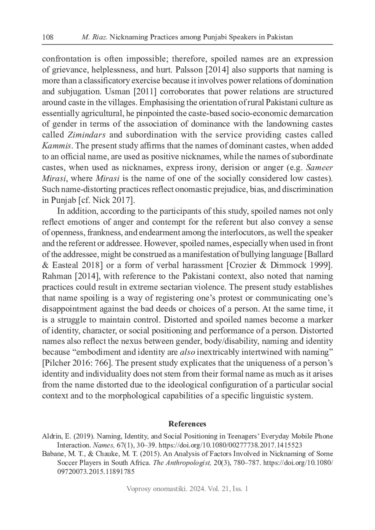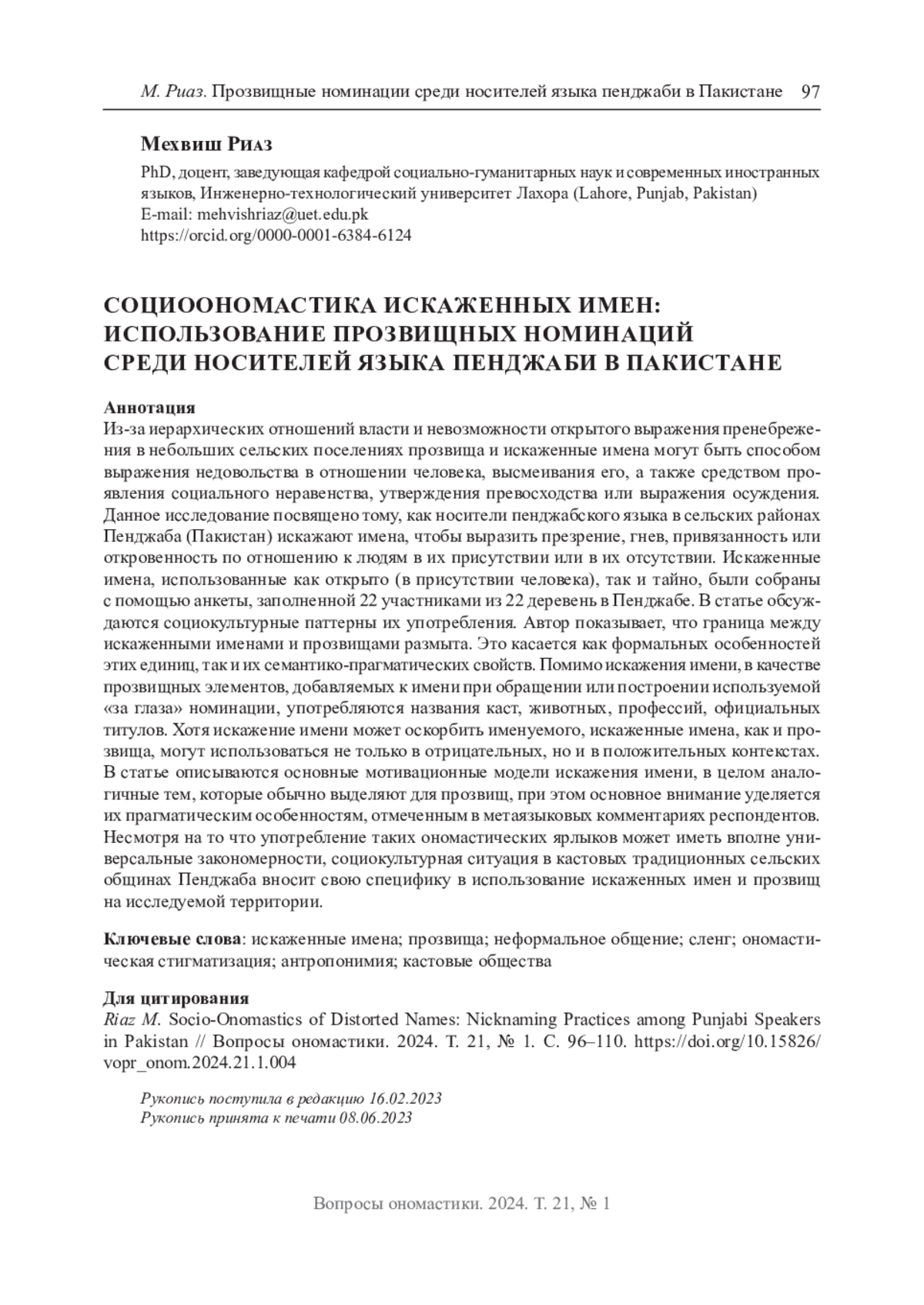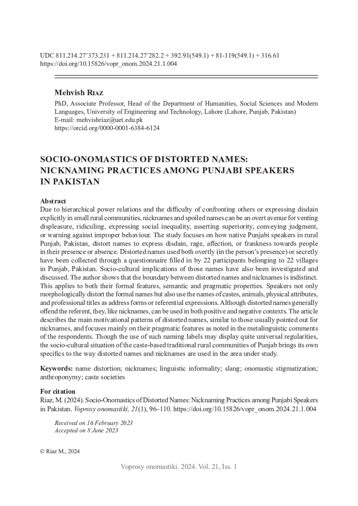 Из-за иерархических отношений власти и невозможности открытого выражения пренебрежения в небольших сельских поселениях прозвища и искаженные имена могут быть способом выражения недовольства в отношении человека, высмеивания его, а также средством проявления социального неравенства, утверждения превосходства или выражения осуждения. Данное исследование посвящено тому, как носители пенджабского языка в сельских районах Пенджаба (Пакистан) искажают имена, чтобы выразить презрение, гнев, привязанность или откровенность по отношению к людям в их присутствии или в их отсутствии. Искаженные имена, использованные как открыто (в присутствии человека), так и тайно, были собраны с помощью анкеты, заполненной 22 участниками из 22 деревень в Пенджабе. В статье обсуждаются социокультурные паттерны их употребления. Автор показывает, что граница между искаженными именами и прозвищами размыта. Это касается как формальных особенностей этих единиц, так и их семантико-прагматических свойств. Помимо искажения имени, в качестве прозвищных элементов, добавляемых к имени при обращении или построении используемой «за глаза» номинации, употребляются названия каст, животных, профессий, официальных титулов. Хотя искажение имени может оскорбить именуемого, искаженные имена, как и прозвища, могут использоваться не только в отрицательных, но и в положительных контекстах. В статье описываются основные мотивационные модели искажения имени, в целом аналогичные тем, которые обычно выделяют для прозвищ, при этом основное внимание уделяется их прагматическим особенностям, отмеченным в метаязыковых комментариях респондентов. Несмотря на то что употребление таких ономастических ярлыков может иметь вполне универсальные закономерности, социокультурная ситуация в кастовых традиционных сельских общинах Пенджаба вносит свою специфику в использование искаженных имен и прозвищ на исследуемой территории.