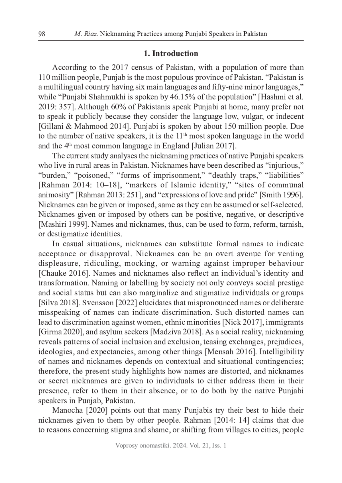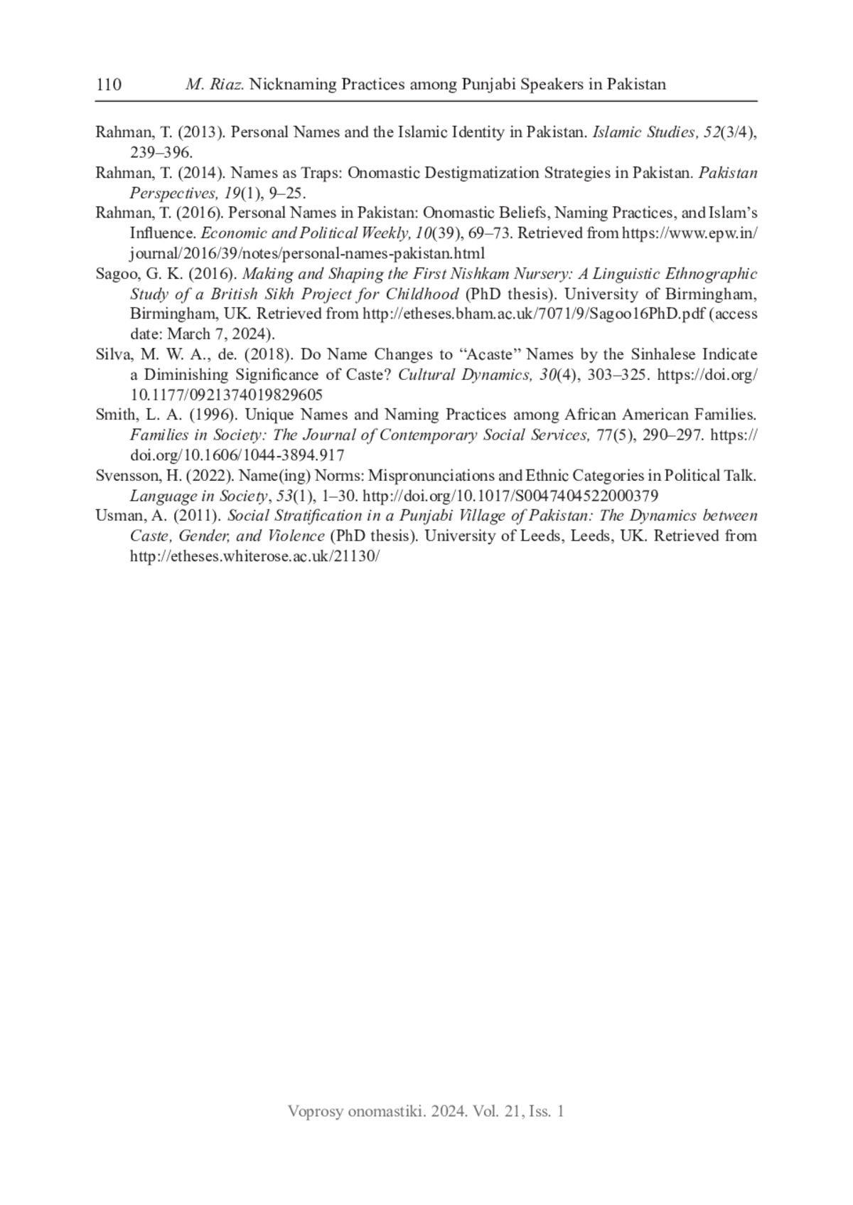 23. Rahman T. (2016). Personal Names in Pakistan: Onomastic Beliefs, Naming Practices, and Islam’s Infl uence. Economic and Political Weekly, 10(39), 69-73. Retrieved from https://www.epw.in/journal/2016/39/notes/personal-names-pakistan.html.