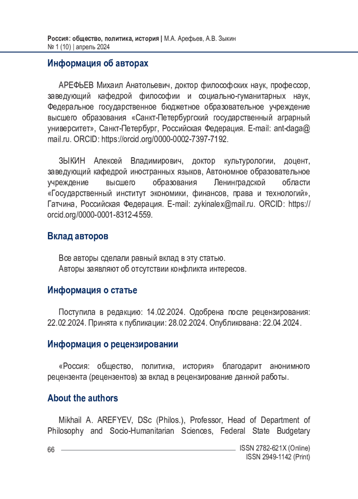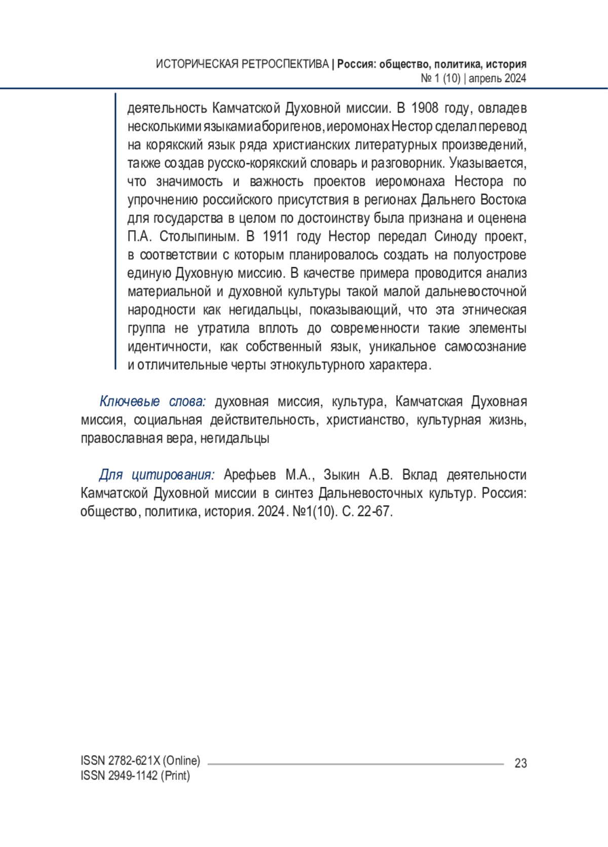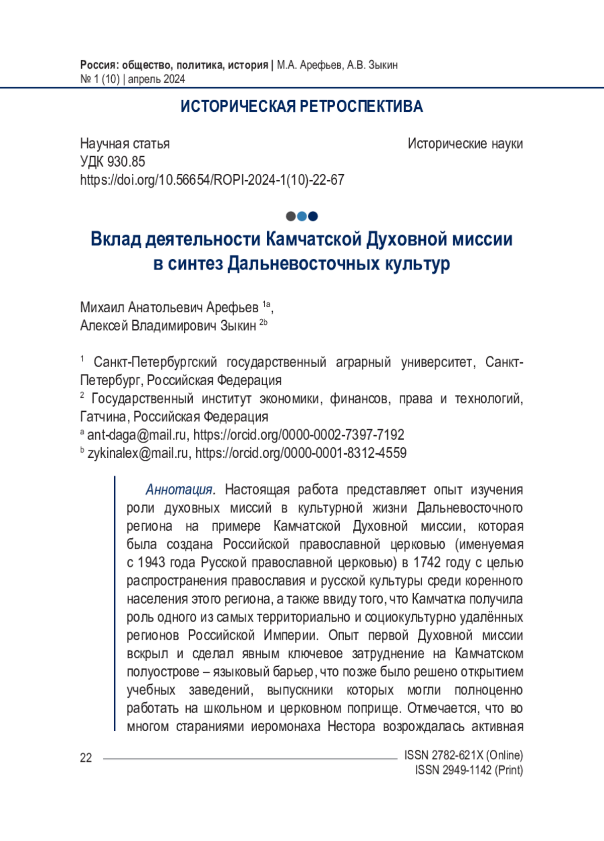 9. Зыкин А.В., Арефьев М.А., Давыденкова А.Г. (2024), Православное старообрядчество в синтезе культур Забайкальского региона (к истории Духовных миссий Забайкалья) [Orthodox Old Believers in the Synthesis of cultures of the Trans-Baikal region (on the History of the Spiritual Missions of Transbaikalia)]. Философская мысль (принято в печать).