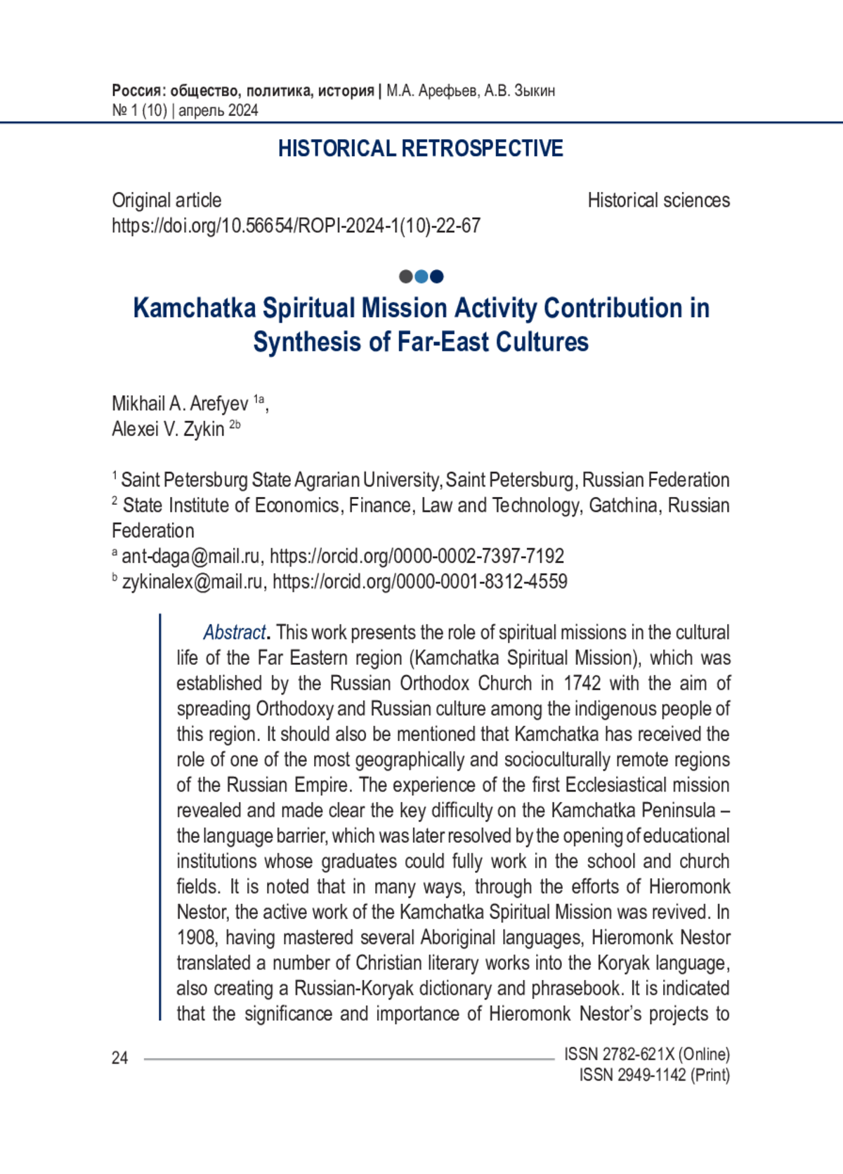 Настоящая работа представляет опыт изучения роли духовных миссий в культурной жизни Дальневосточного региона на примере Камчатской Духовной миссии, которая была создана Российской православной церковью (именуемая с 1943 года Русской православной церковью) в 1742 году с целью распространения православия и русской культуры среди коренного населения этого региона, а также ввиду того, что Камчатка получила роль одного из самых территориально и социокультурно удалённых регионов Российской Империи. Опыт первой Духовной миссии вскрыл и сделал явным ключевое затруднение на Камчатском полуострове – языковый барьер, что позже было решено открытием учебных заведений, выпускники которых могли полноценно работать на школьном и церковном поприще. Отмечается, что во многом стараниями иеромонаха Нестора возрождалась активная деятельность Камчатской Духовной миссии. В 1908 году, овладев несколькими языками аборигенов, иеромонах Нестор сделал перевод на корякский язык ряда христианских литературных произведений, также создав русско-корякский словарь и разговорник. Указывается, что значимость и важность проектов иеромонаха Нестора по упрочнению российского присутствия в регионах Дальнего Востока для государства в целом по достоинству была признана и оценена П. A. Столыпиным. В 1911 году Нестор передал Синоду проект, в соответствии с которым планировалось создать на полуострове единую Духовную миссию. В качестве примера проводится анализ материальной и духовной культуры такой малой дальневосточной народности как негидальцы, показывающий, что эта этническая группа не утратила вплоть до современности такие элементы идентичности, как собственный язык, уникальное самосознание и отличительные черты этнокультурного характера.