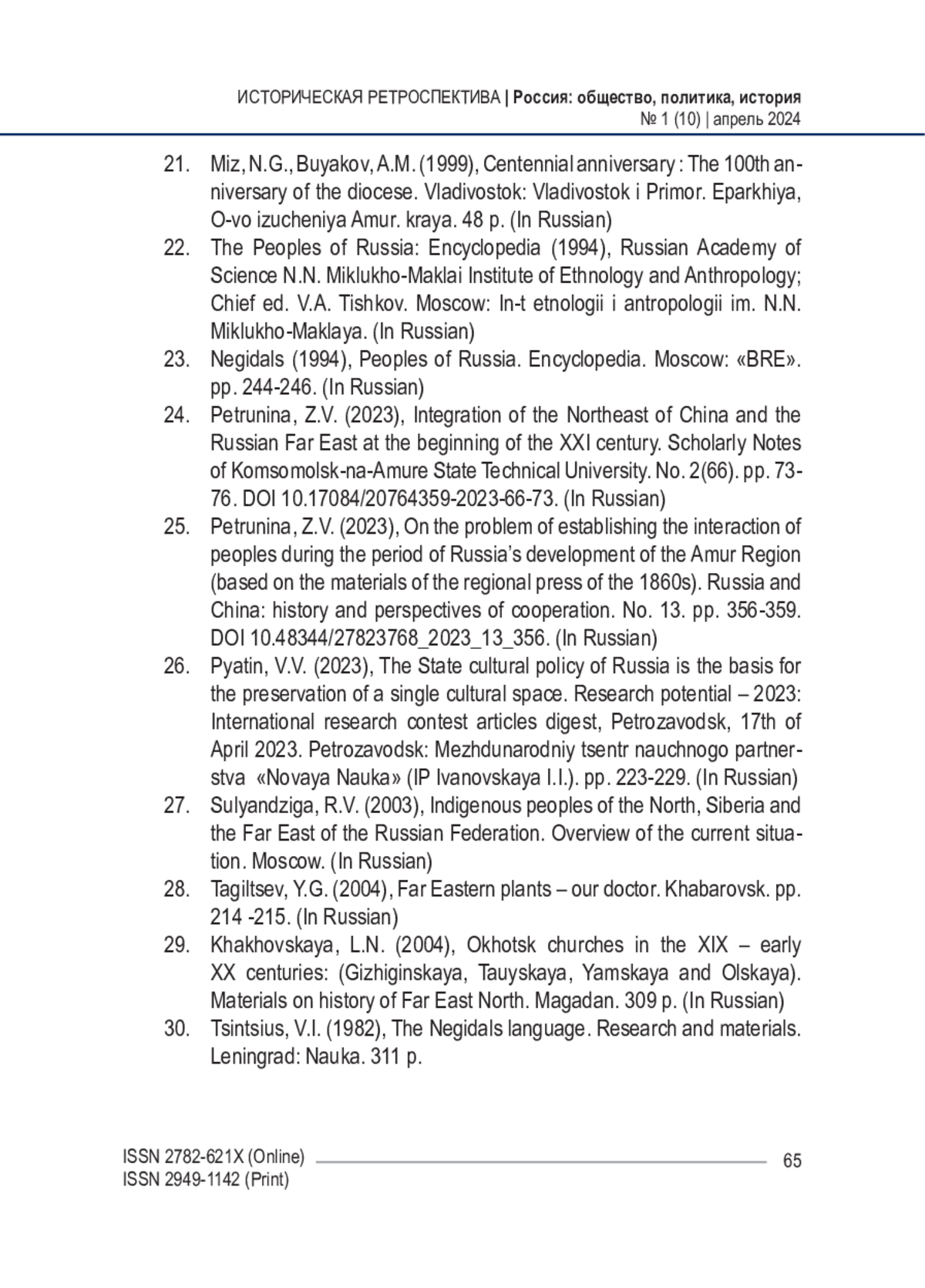 25. Петрунина Ж.В. (2023), К проблеме установления взаимодействия народов в период освоения Россией Приамурья (по материалам региональной печати 1860-х гг.) [On the problem of establishing the interaction of peoples during the period of Russia’s development of the Amur Region (based on the materials of the regional press of the 1860s)]. Россия и Китай: история и перспективы сотрудничества. № 13. С. 356-359. https://doi.org/10.48344/27823768_2023_13_356.