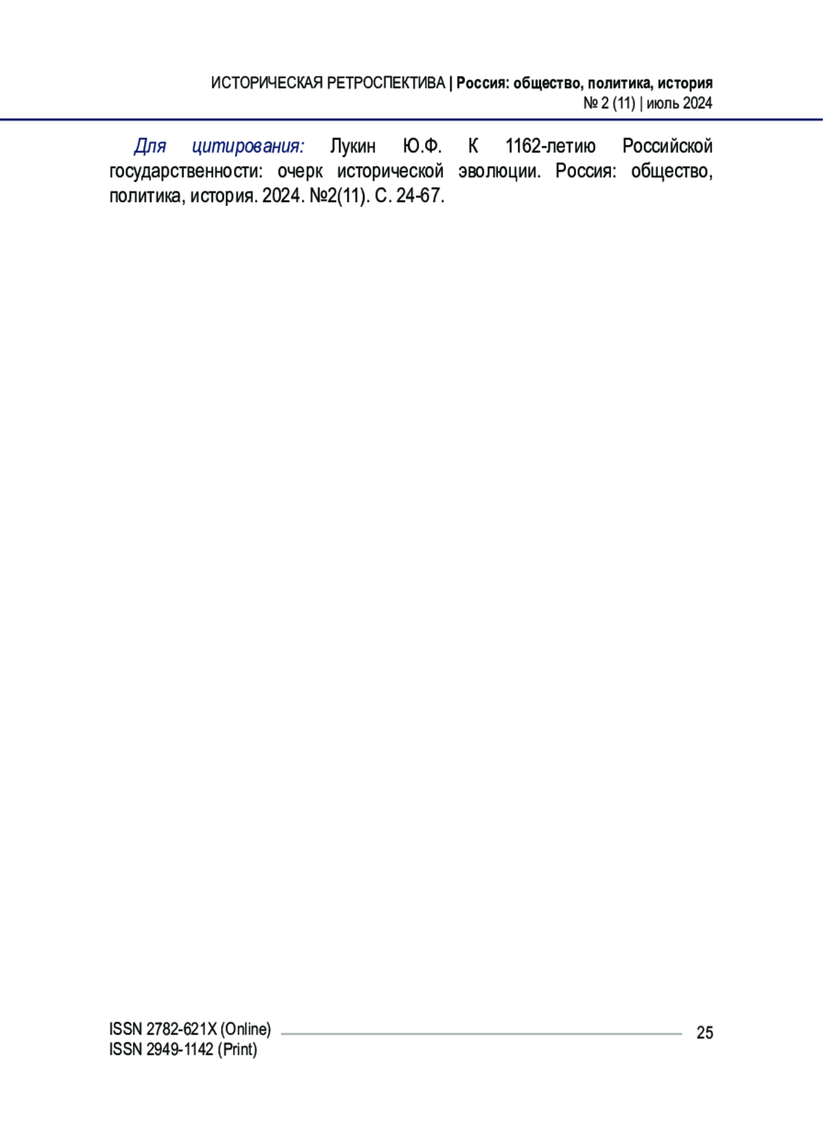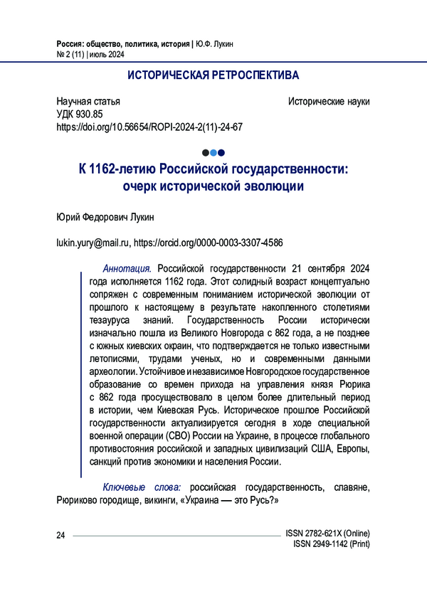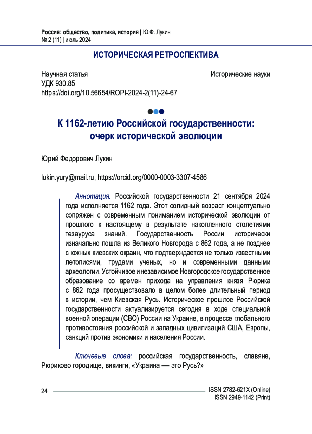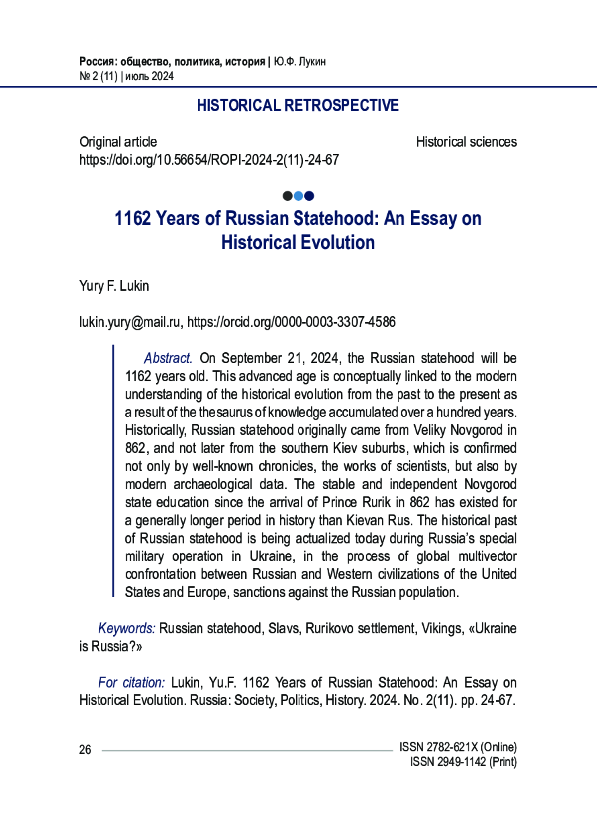 Российской государственности 21 сентября 2024 года исполняется 1162 года. Этот солидный возраст концептуально сопряжен с современным пониманием исторической эволюции от прошлого к настоящему в результате накопленного столетиями тезауруса знаний. Государственность России исторически изначально пошла из Великого Новгорода с 862 года, а не позднее с южных киевских окраин, что подтверждается не только известными летописями, трудами ученых, но и современными данными археологии. Устойчивое и независимое Новгородское государственное образование со времен прихода на управления князя Рюрика с 862 года просуществовало в целом более длительный период в истории, чем Киевская Русь. Историческое прошлое Российской государственности актуализируется сегодня в ходе специальной военной операции (СВО) России на Украине, в процессе глобального противостояния российской и западных цивилизаций США, Европы, санкций против экономики и населения России. Ключевые слова: российская государственность, славяне, Рюриково городище, викинги, «Украина — это Русь?»